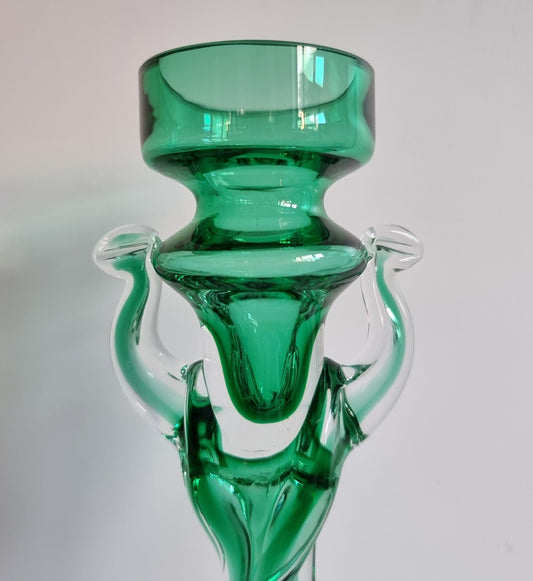 Vintage Jozefina Krosno Green/Clear Art Glass Candlestick/Tealight Holder
