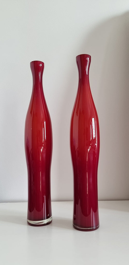 Pair Of Mid-Century Tall Cased Art Glass Bud Vases In Deep Red