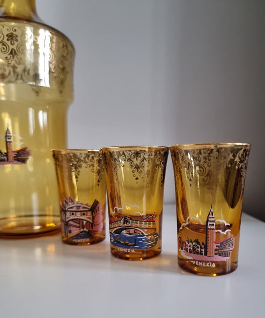 Mid-Century Venetian Amber Glass Decanter & Shot Glasses