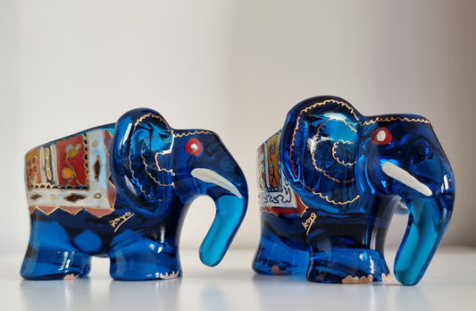 Pair Of Jose Cire Royo Blue Enamelled Glass Elephants