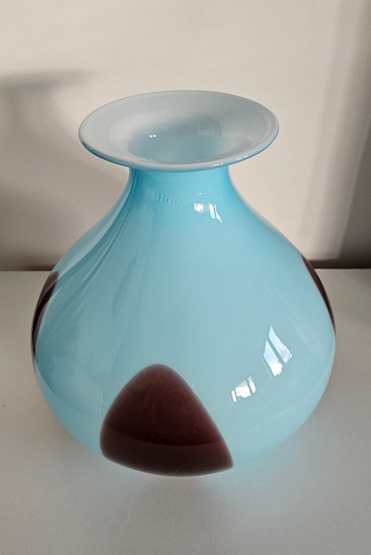 Large Retro Vintage Blue & Brown Bulbous Glass Vase