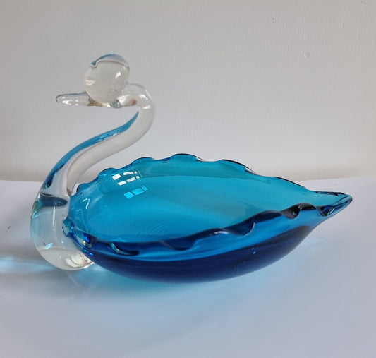 Vintage Turquoise/Clear Art Glass Swan Dish