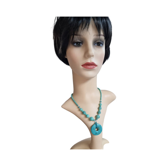 Retro Turquoise Marble Effect Blue/Clear Beads & Donut Shaped Pendant Necklace