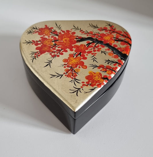 Vintage Hand-Painted Black Laquer Heart Shaped Jewelry Trinket Box