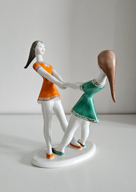 Rare Vintage Hollohaza Porcelain Spinning Girls Figurine - Made in Hungary