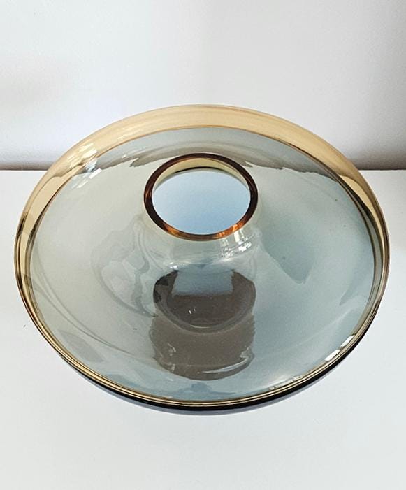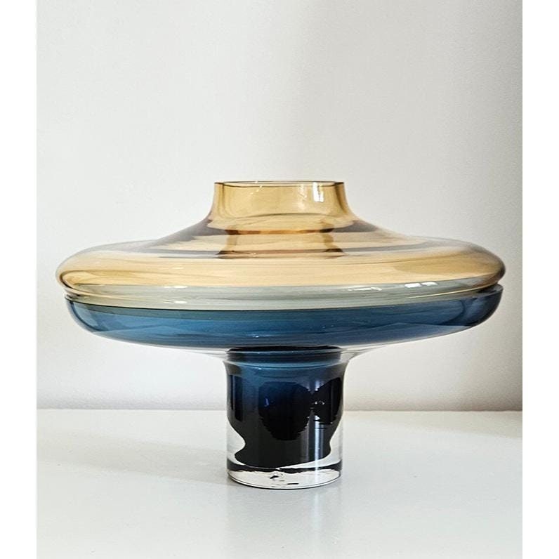 Elevate your space with this exquisite designer Global Views large lidded vase, featuring a striking combination of amber glass over a rich cobalt blue base.