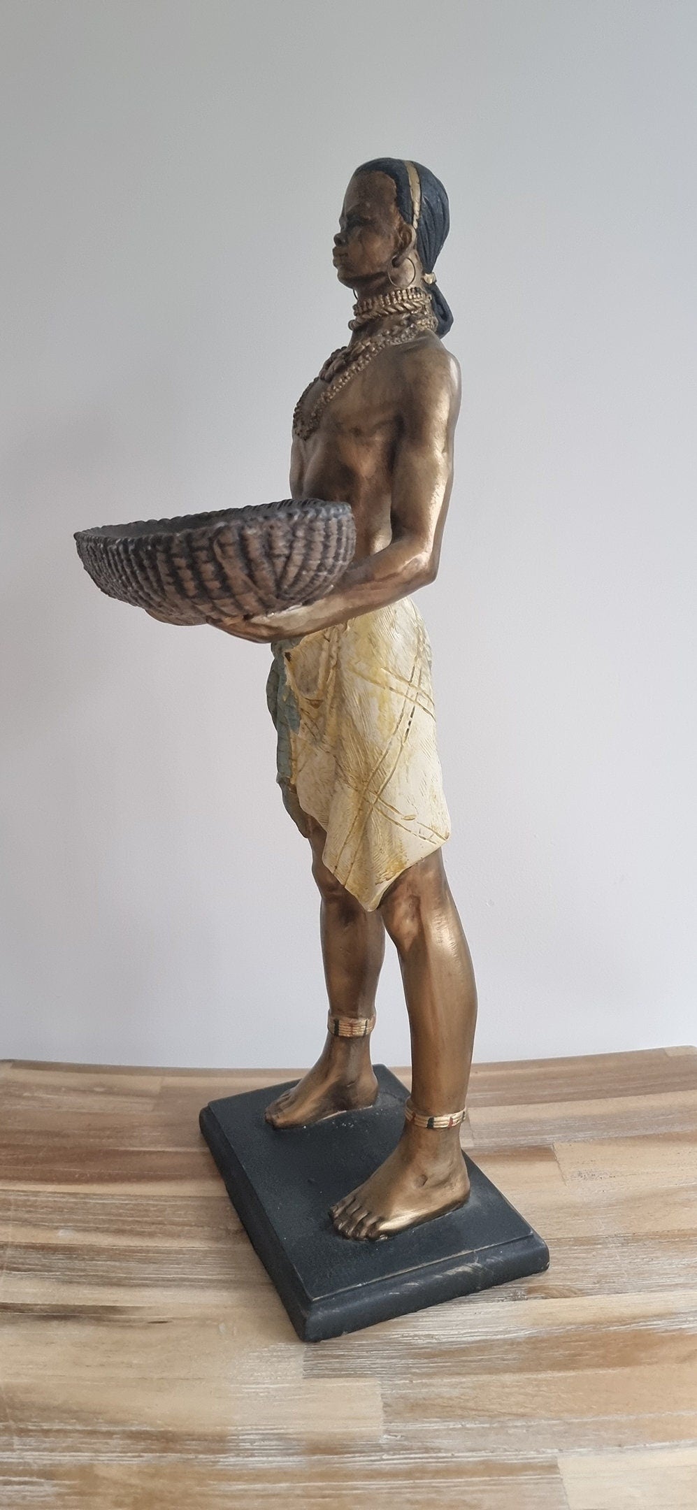 The intricate details of the sculpture, from the texture of the man's skin to the woven basket he holds, are truly breathtaking. Not only is this statue visually striking, it is also culturally significant, representing the strength and beauty of African heritage. Perfect for any collection, it would make a thoughtful gift for someone who appreciates art and culture.