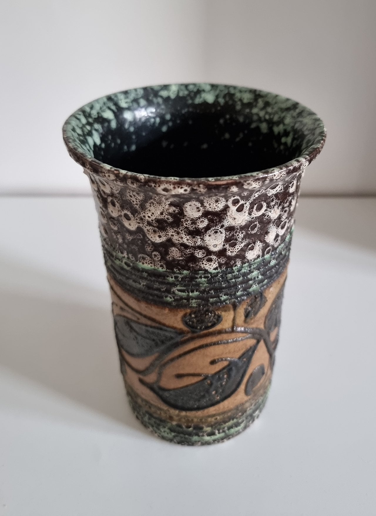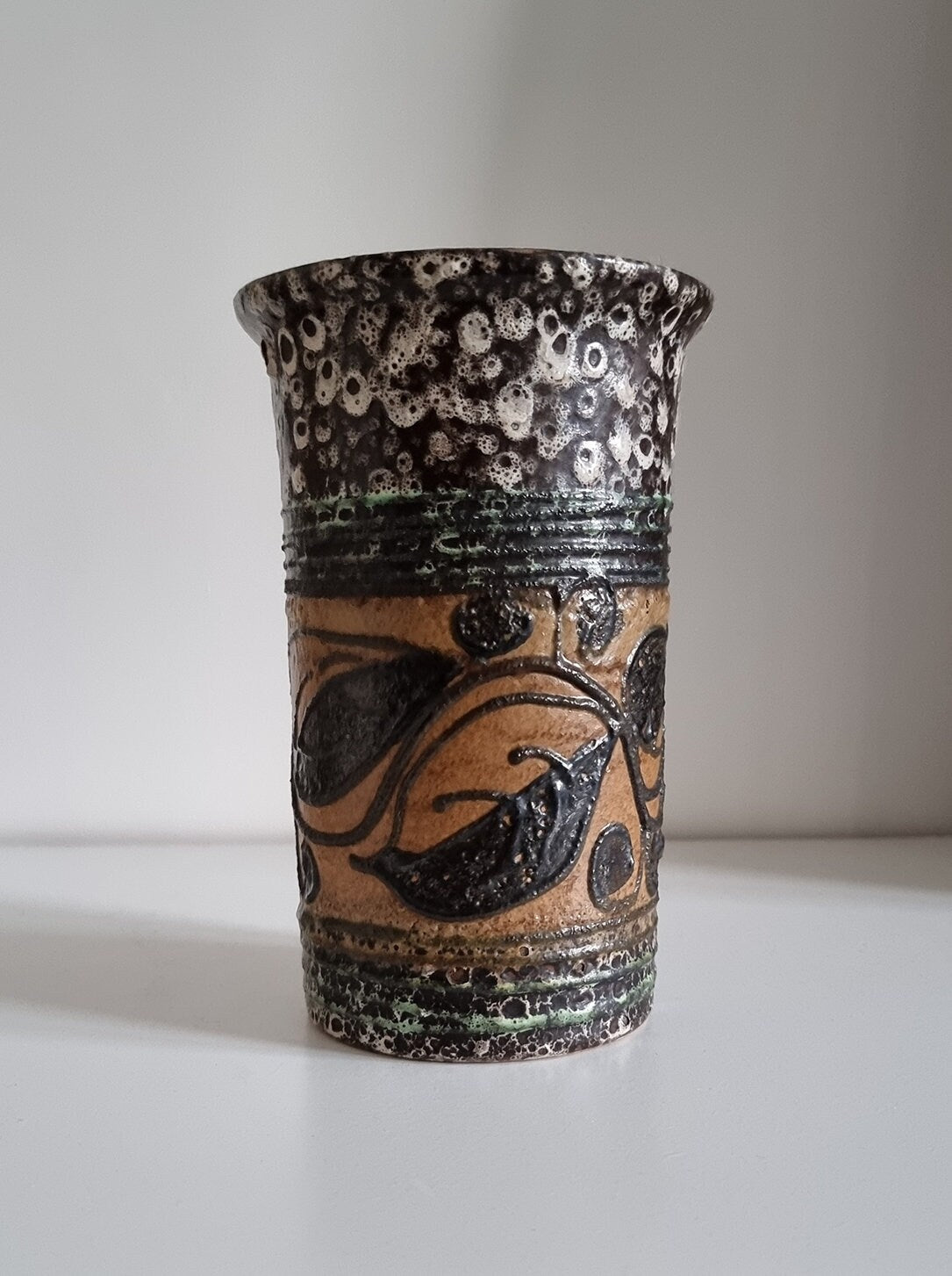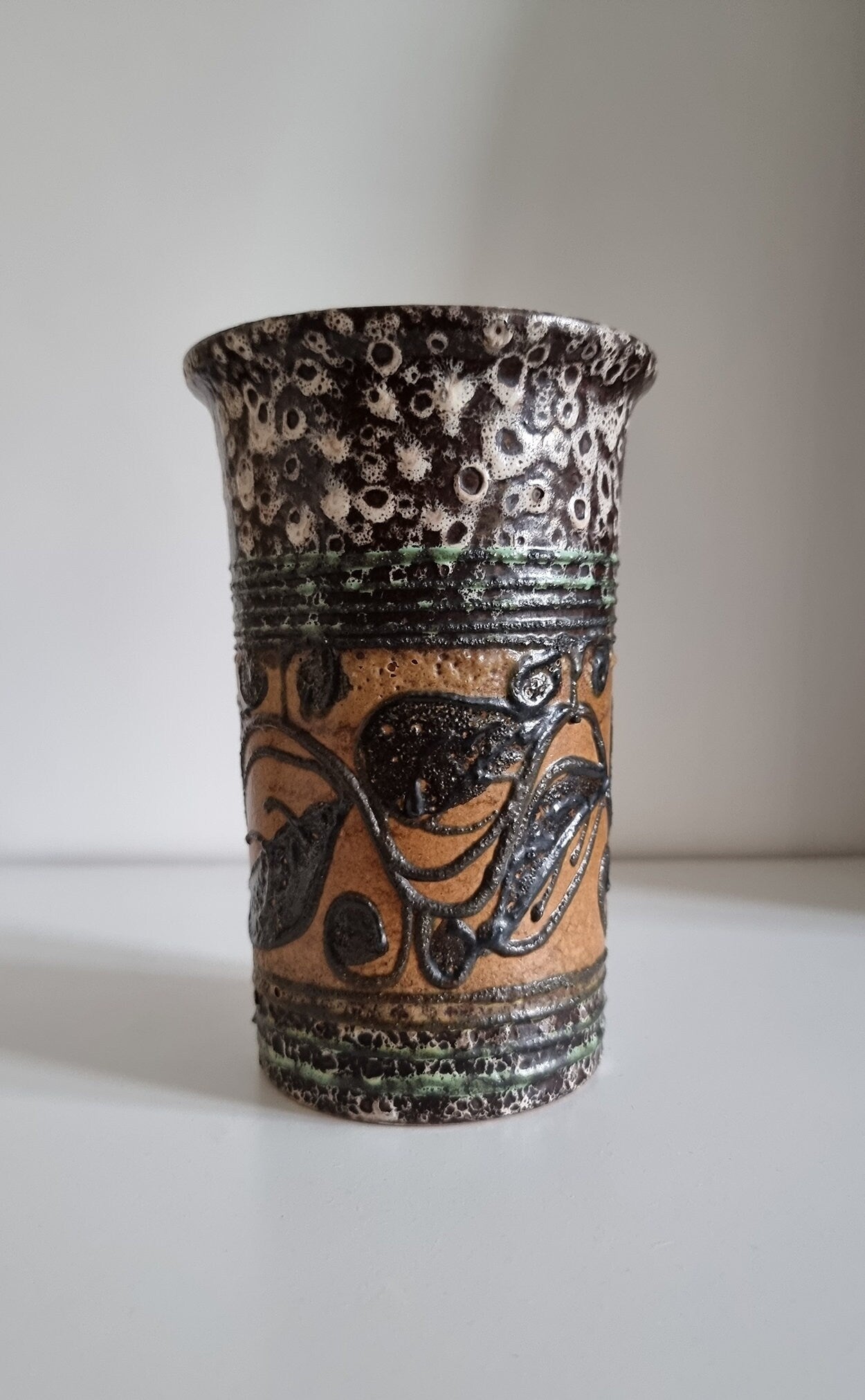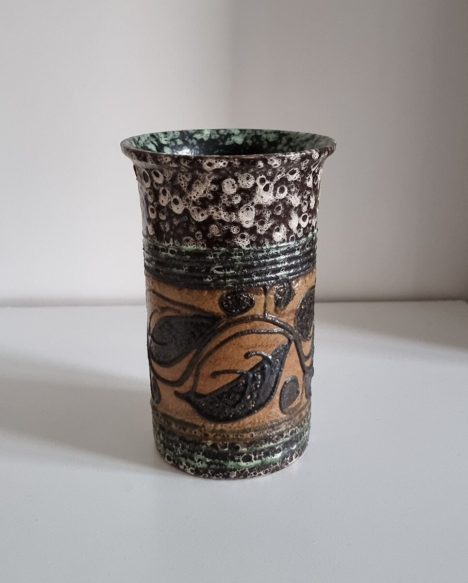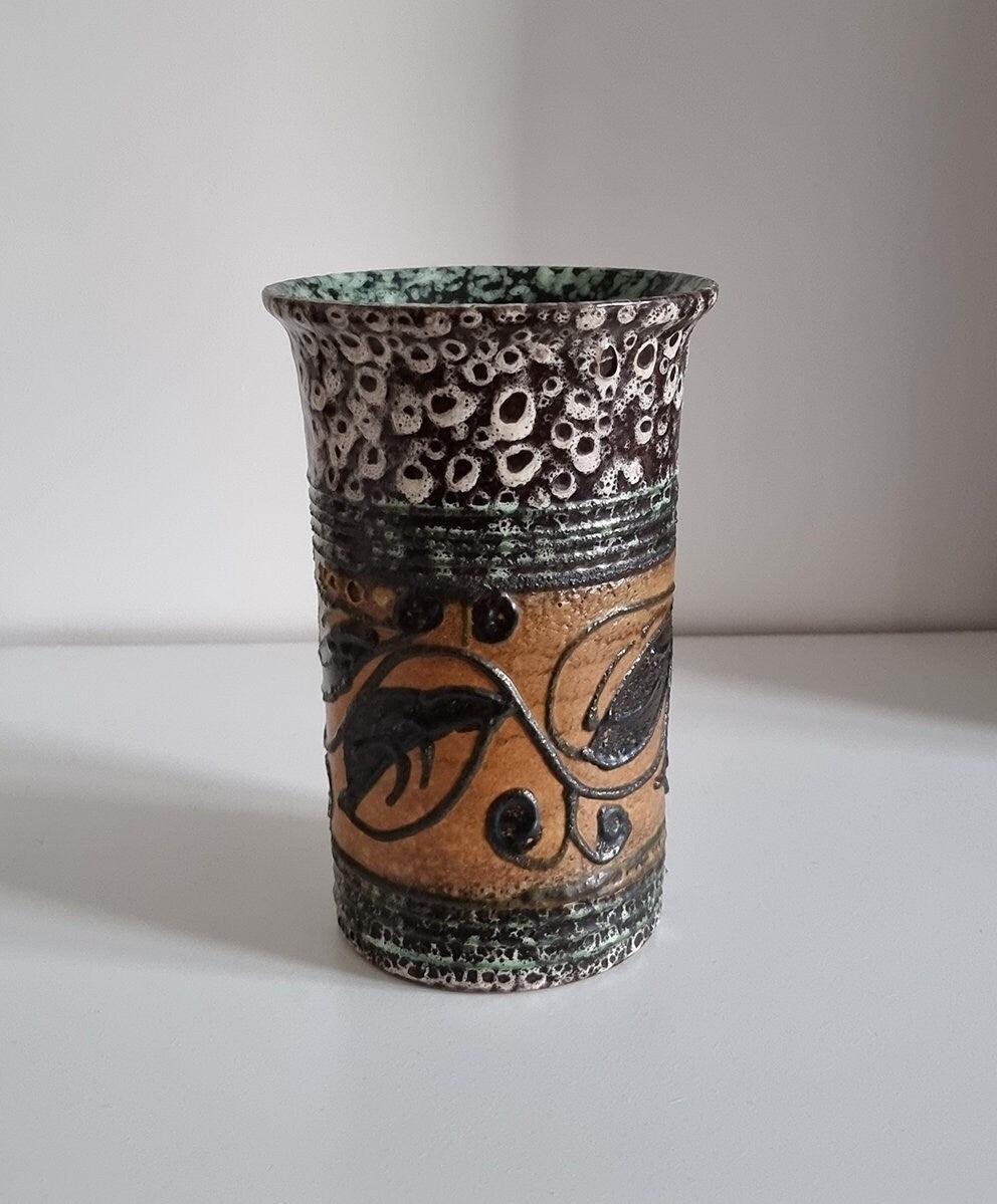 Mid-century hand decorated pottery vase in beautiful condition. There are small imperfections to the glaze, please see last photo for details.