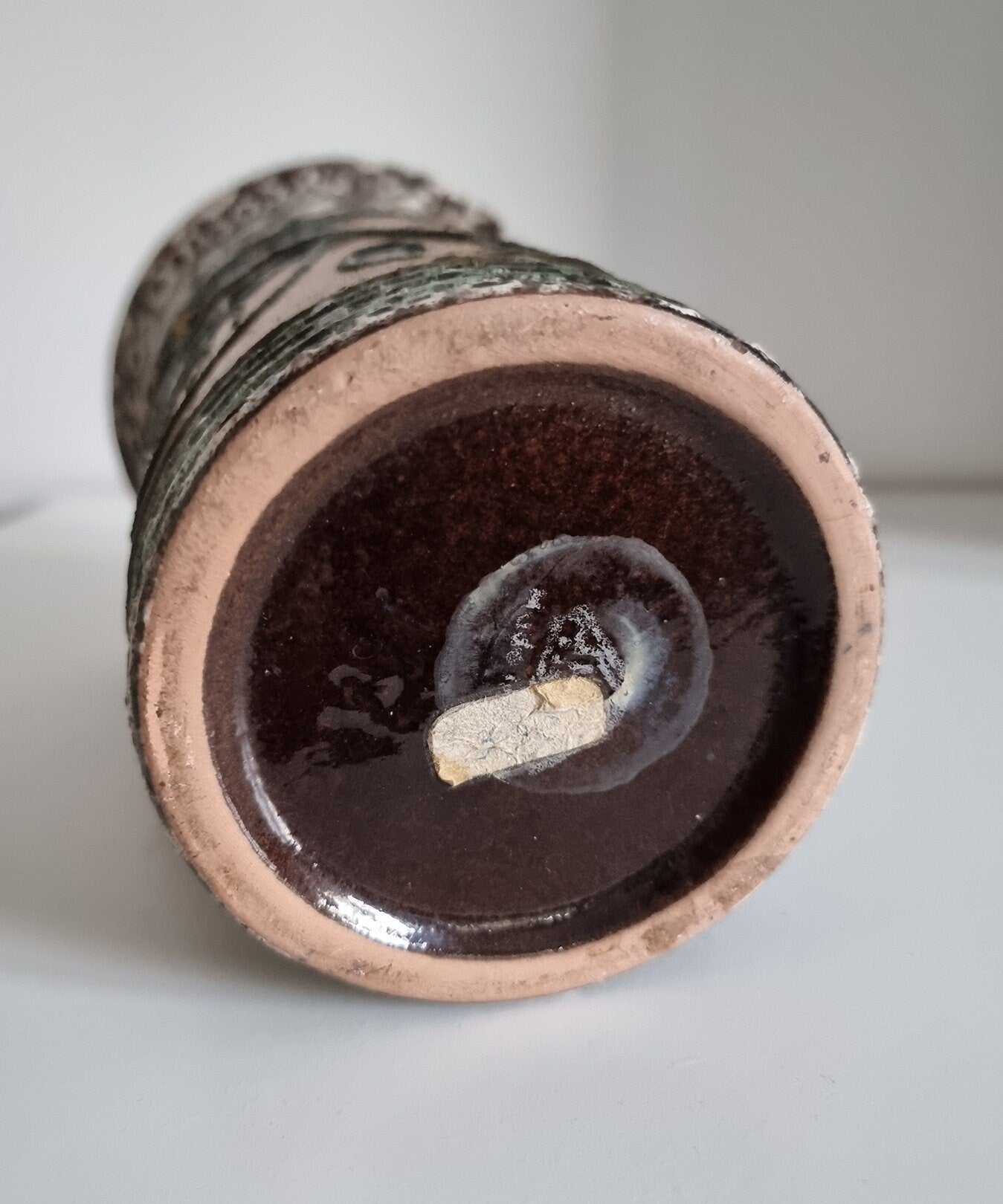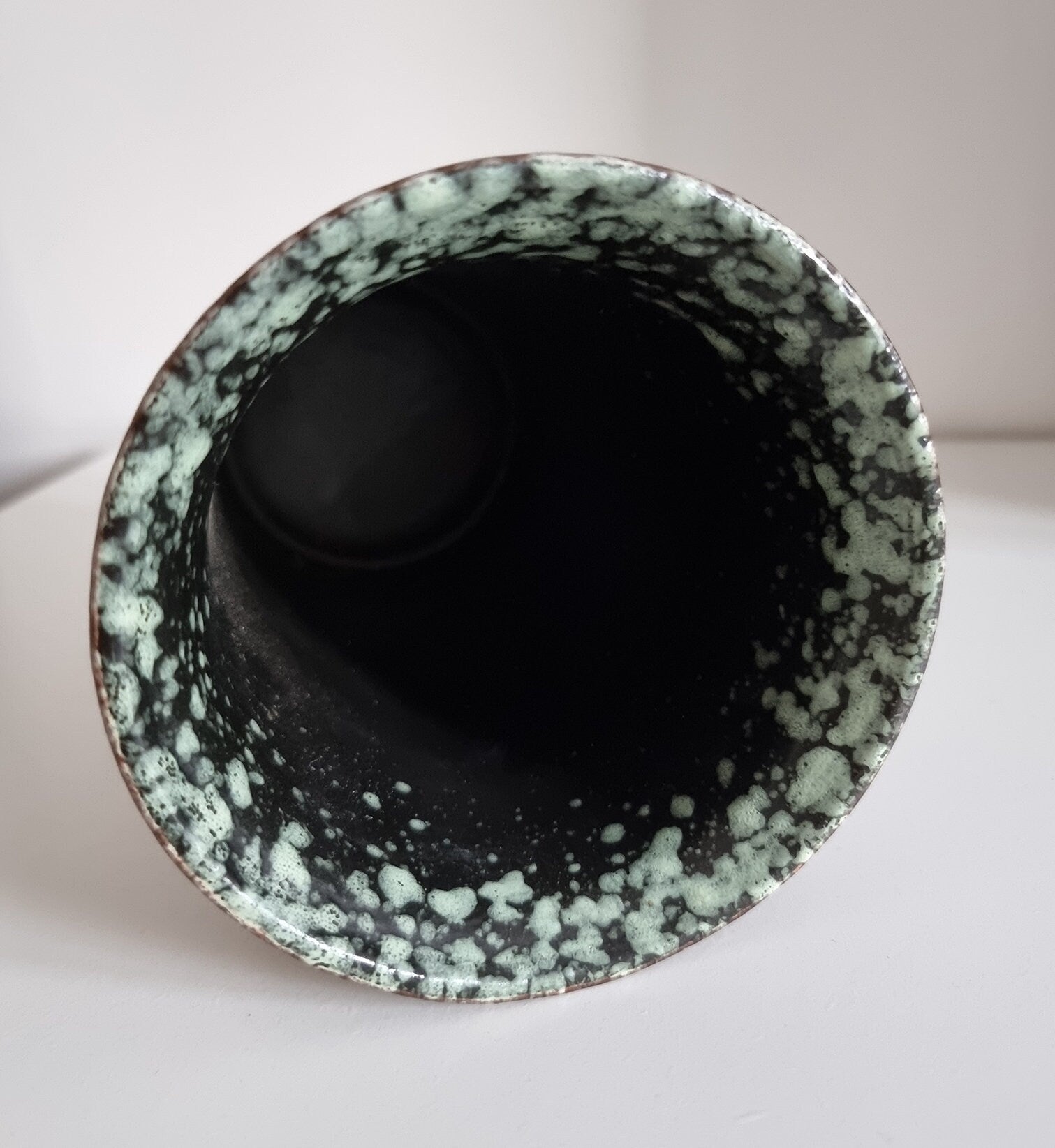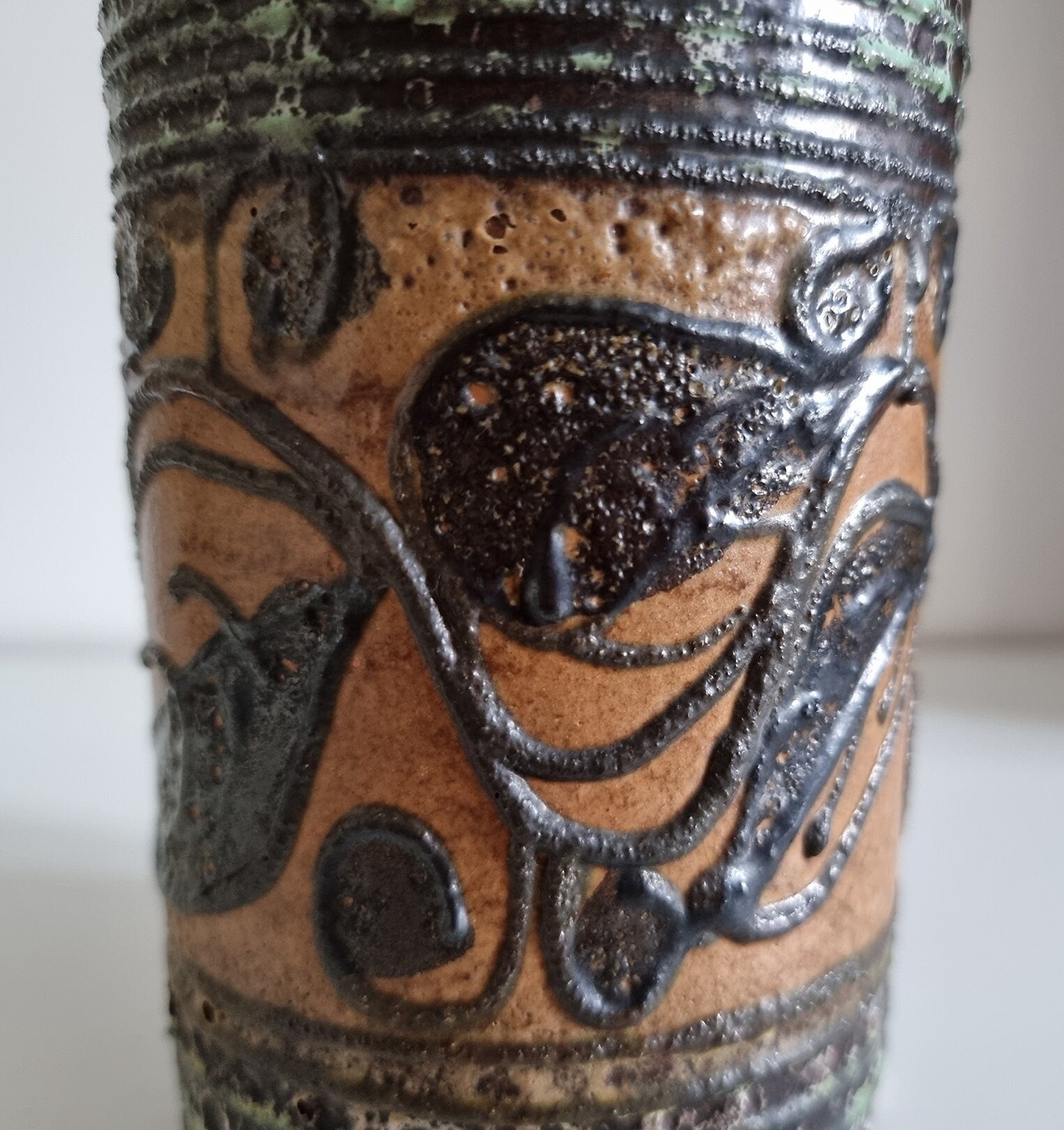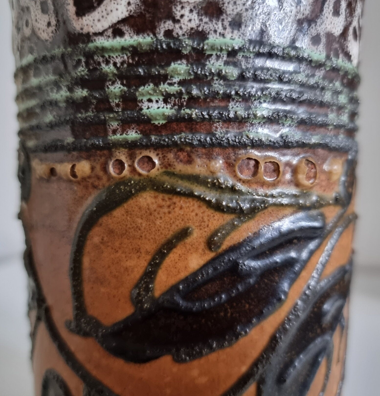 Mid-century hand decorated pottery vase in beautiful condition. There are small imperfections to the glaze, please see last photo for details.