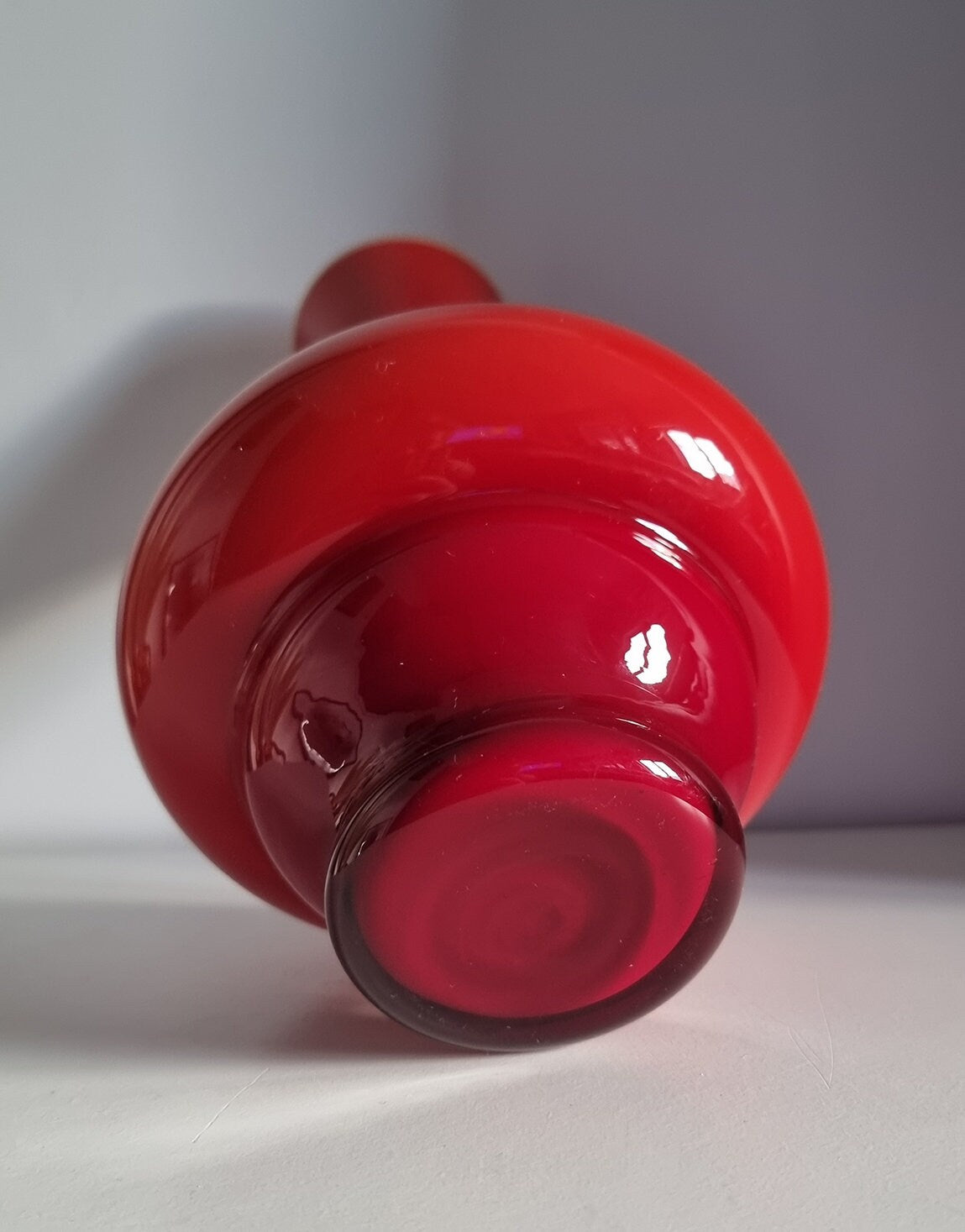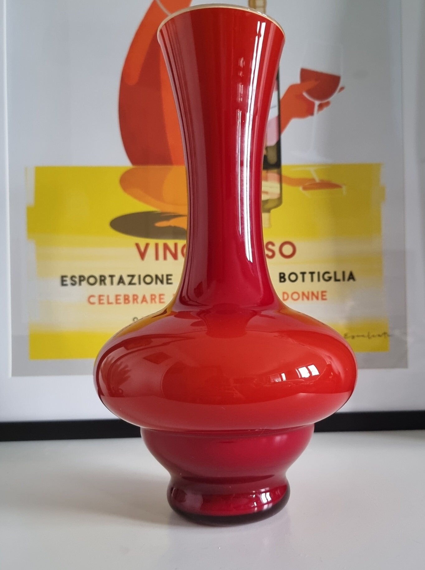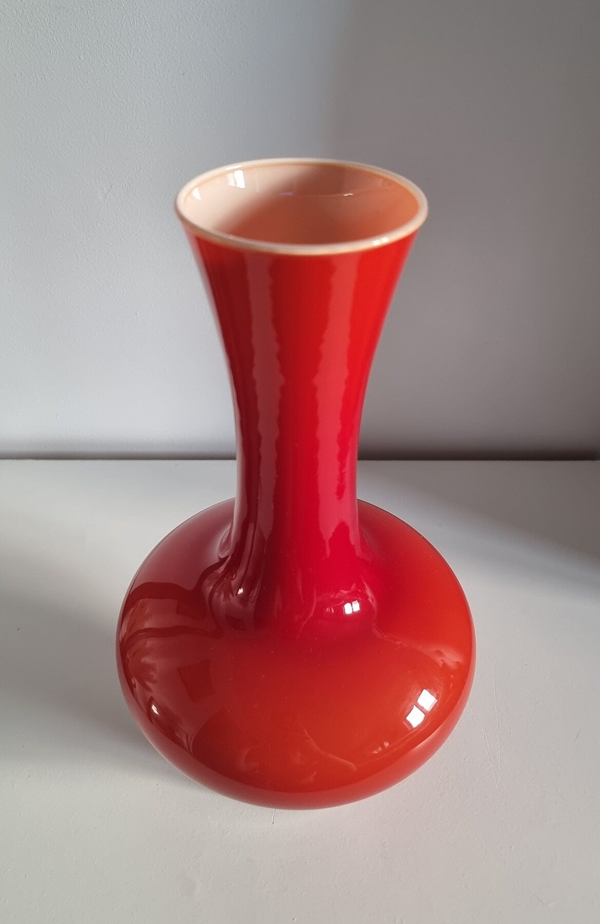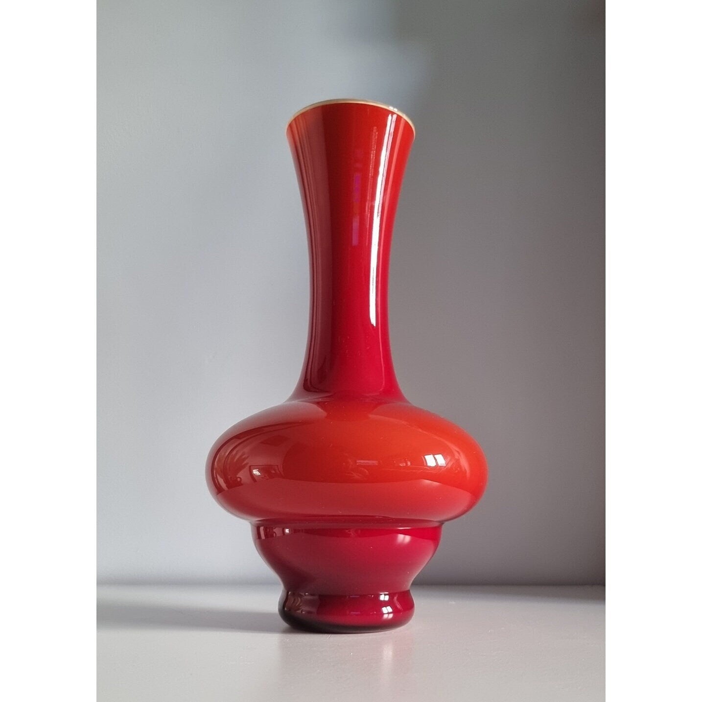 With its elegant shape, vibrant red/orange hue, and captivating hooped design, this vase is a must-have addition to any discerning collector or interior enthusiast.