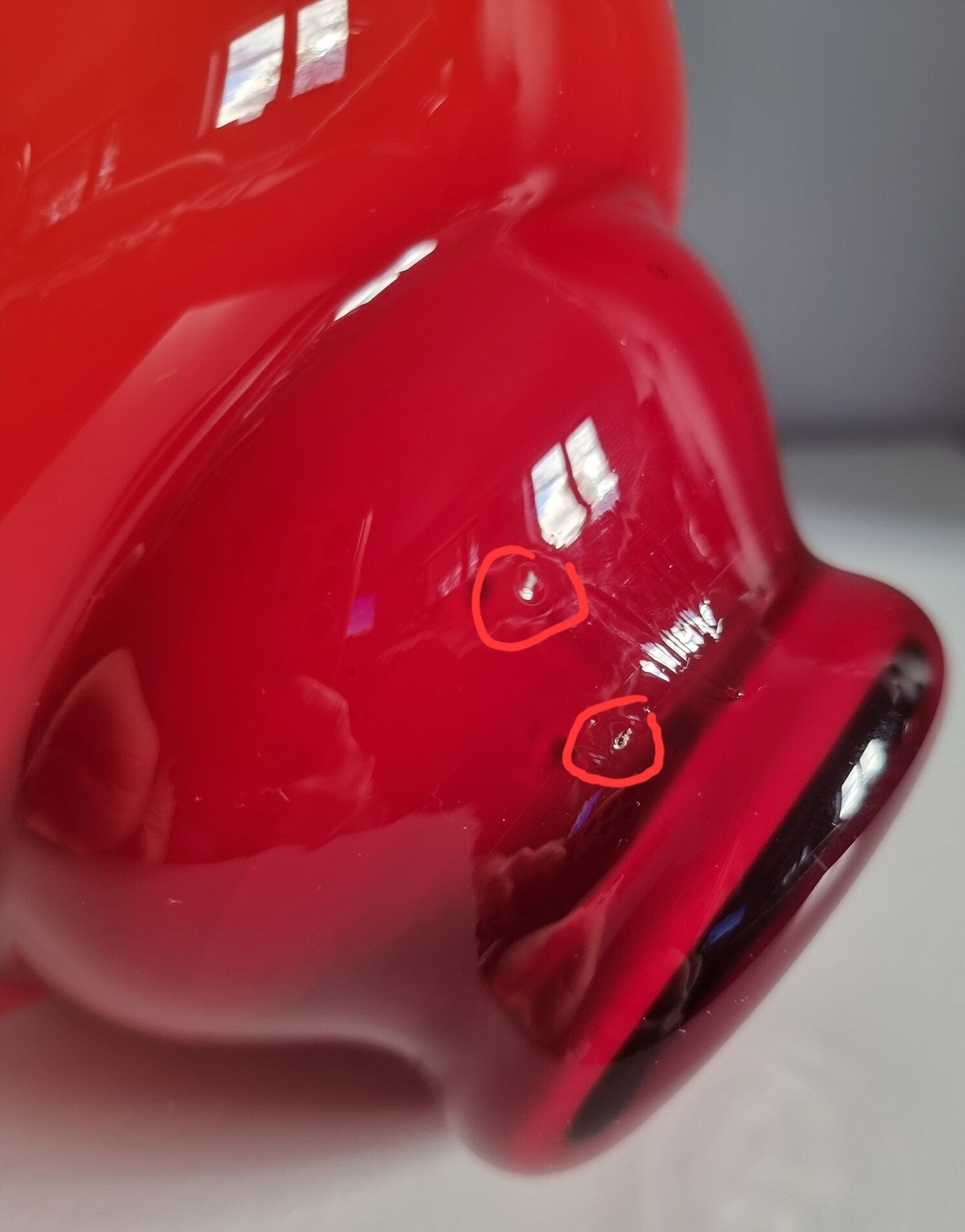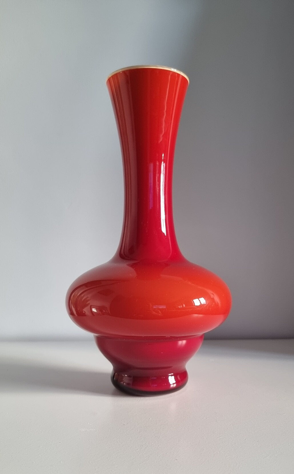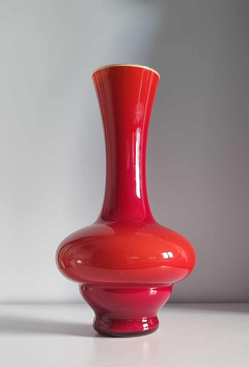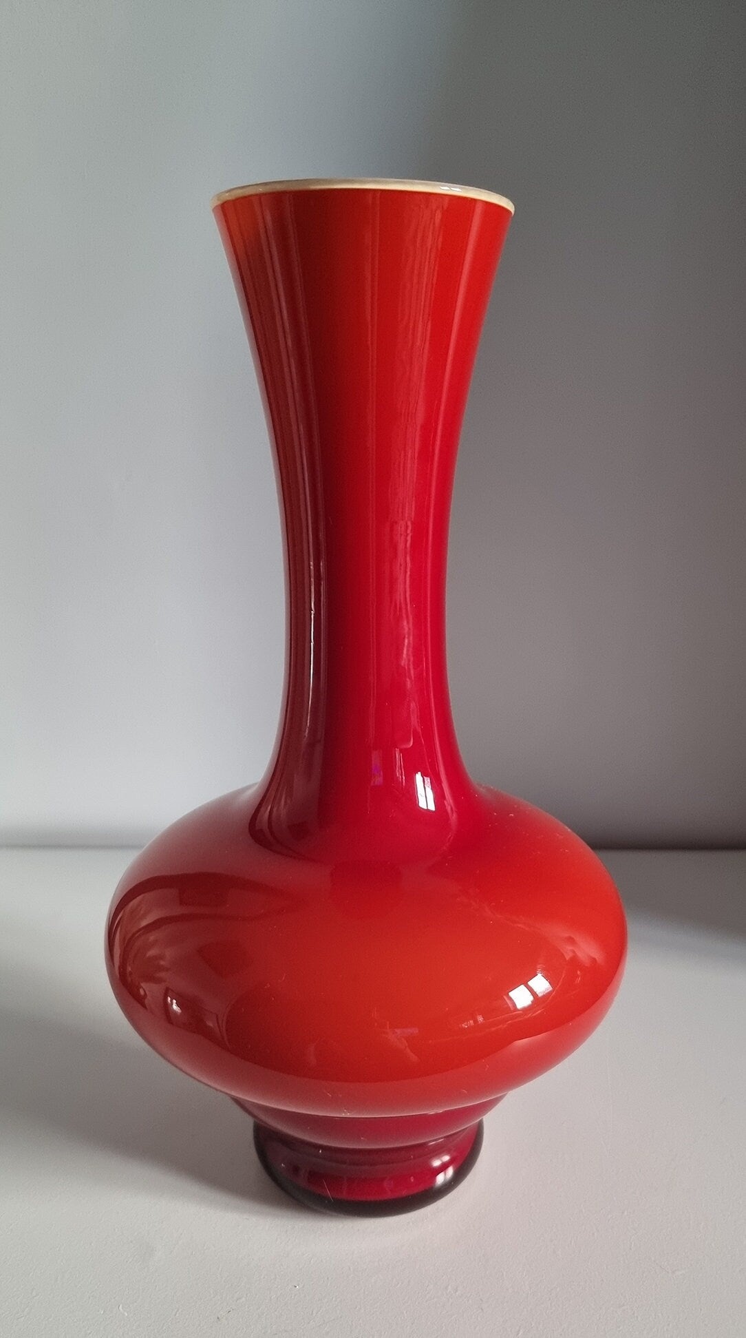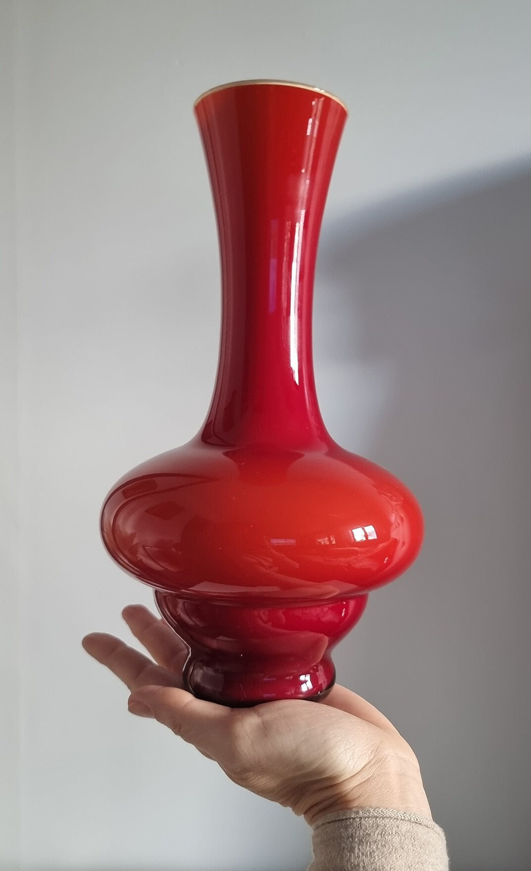 With its elegant shape, vibrant red/orange hue, and captivating hooped design, this vase is a must-have addition to any discerning collector or interior enthusiast.