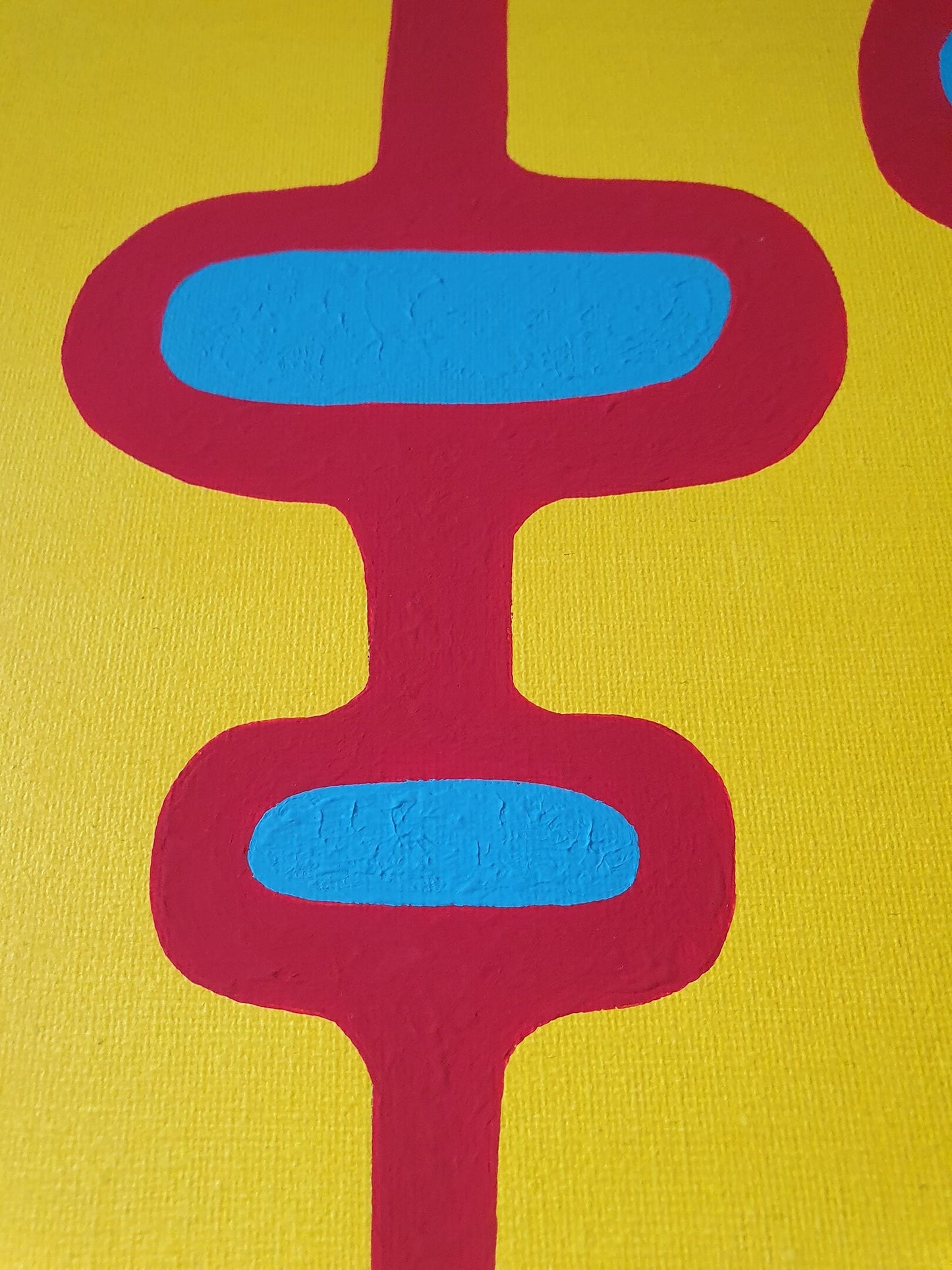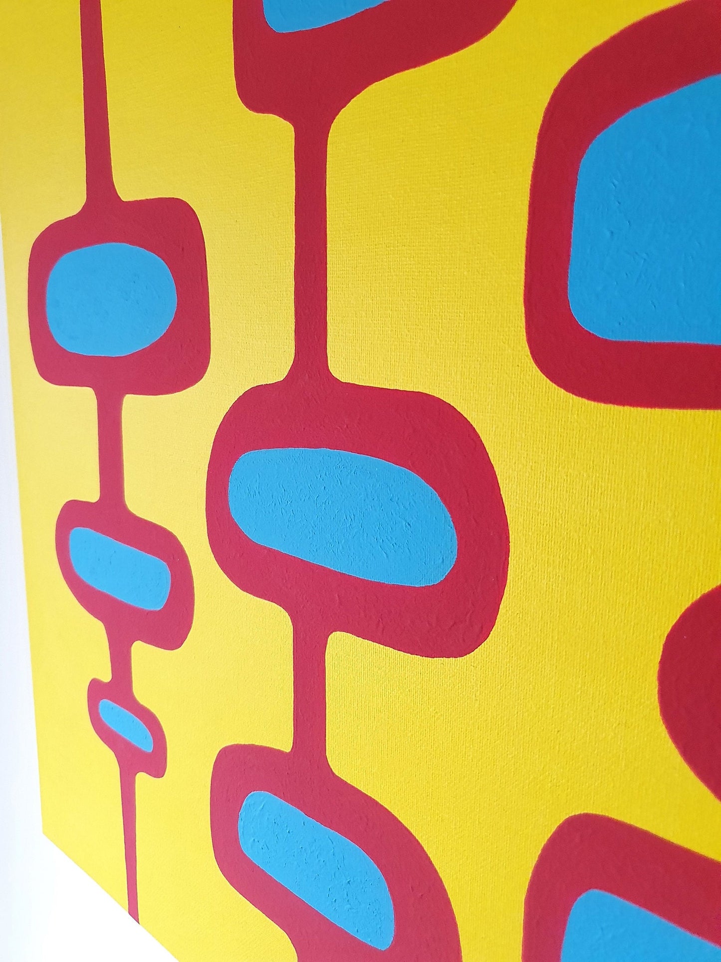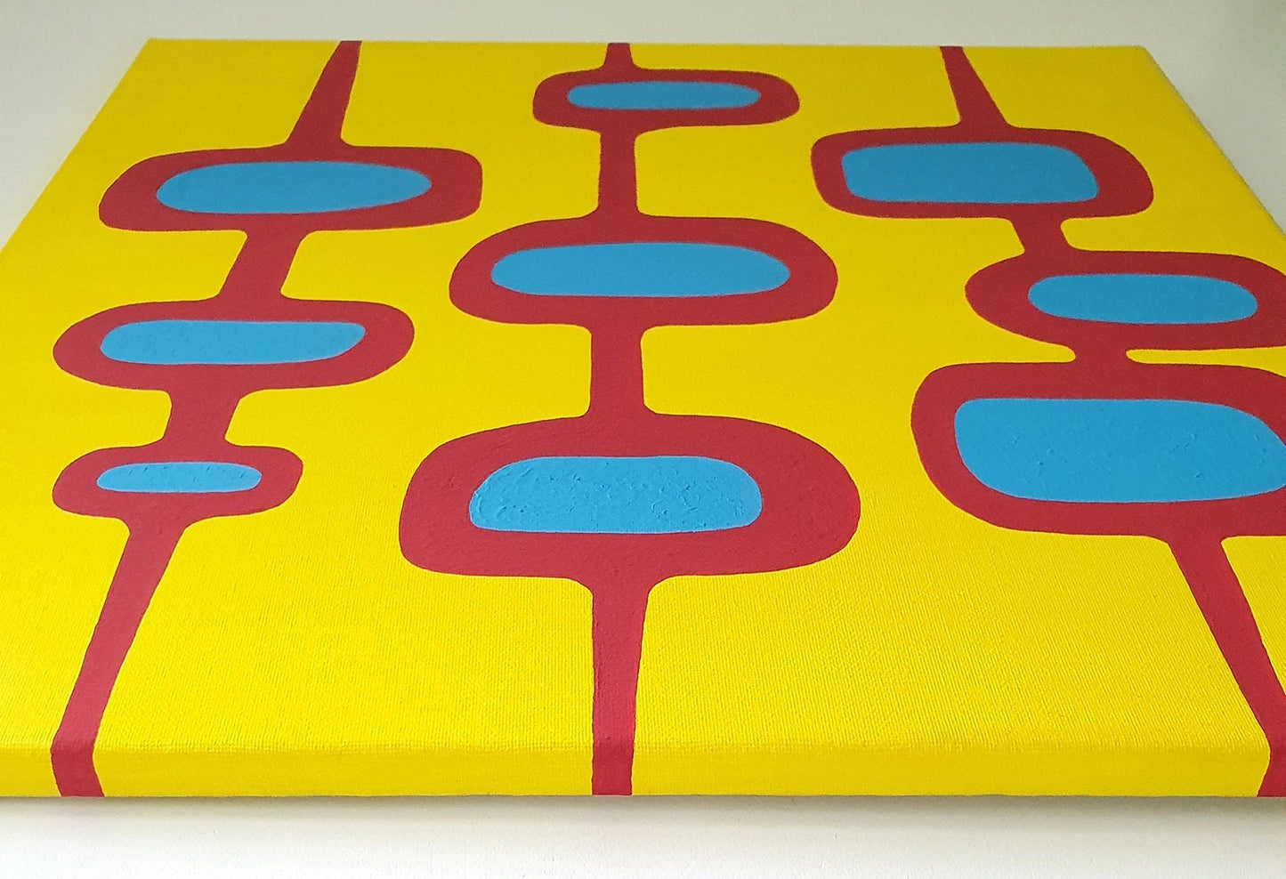 Mid century modern retro inspired abstract acrylic painting, original mcm space age style art - yellow background with red and blue pattern.