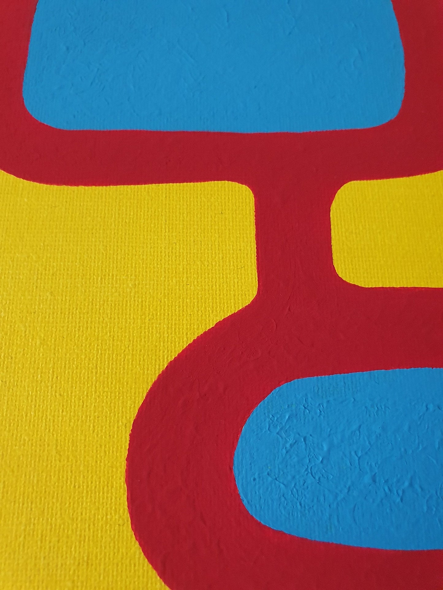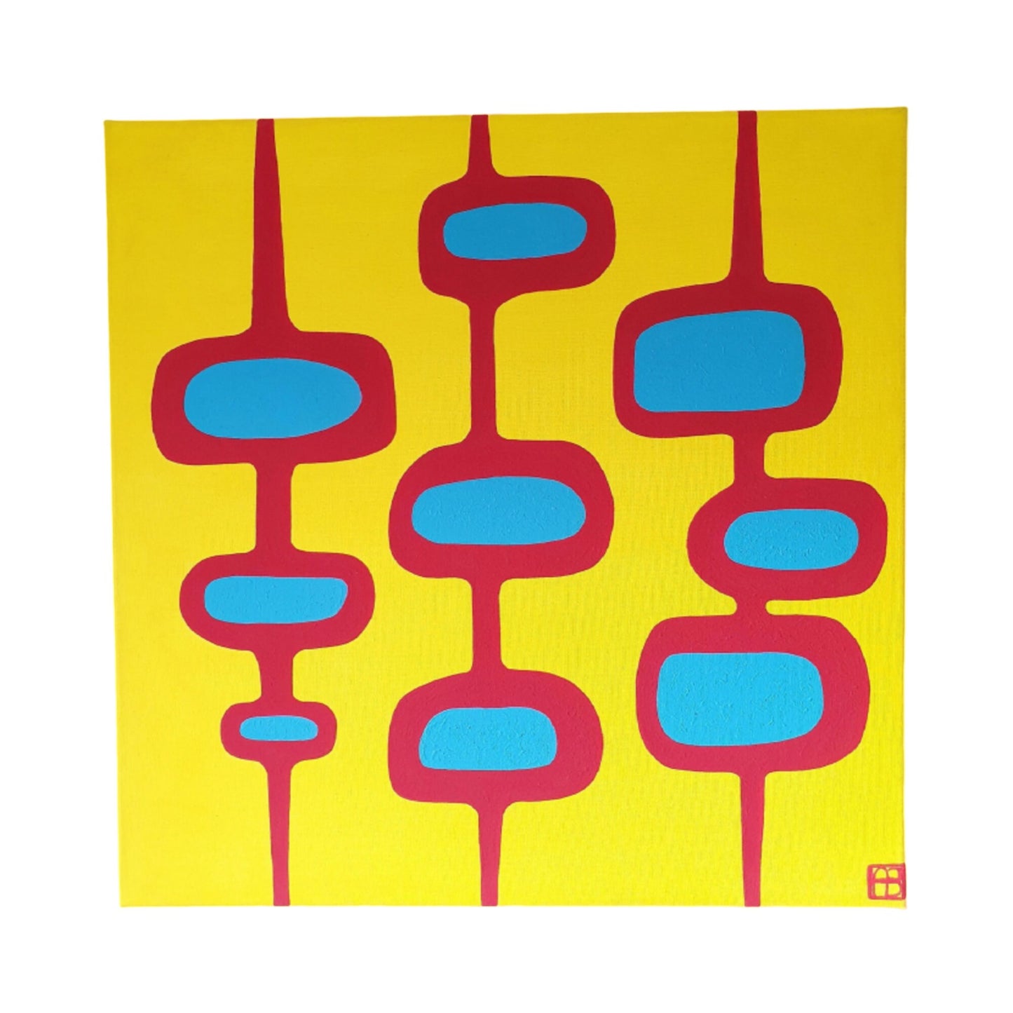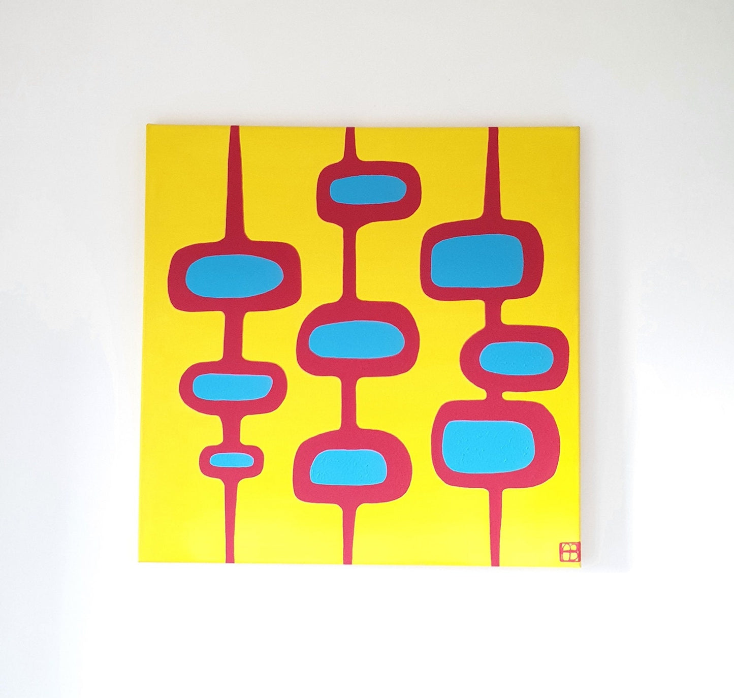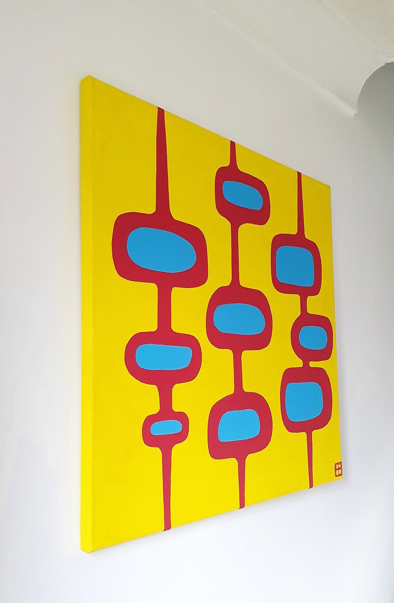 Mid century modern retro inspired abstract acrylic painting, original mcm space age style art - yellow background with red and blue pattern.
