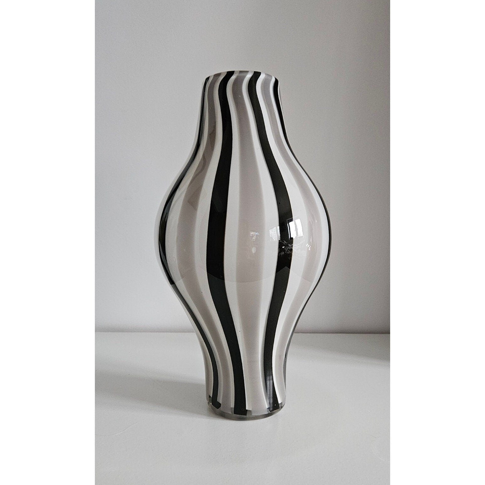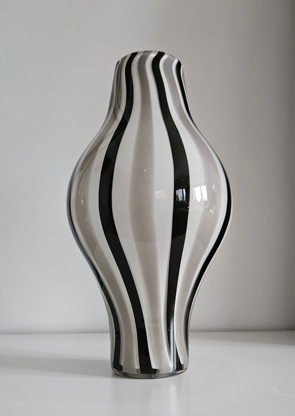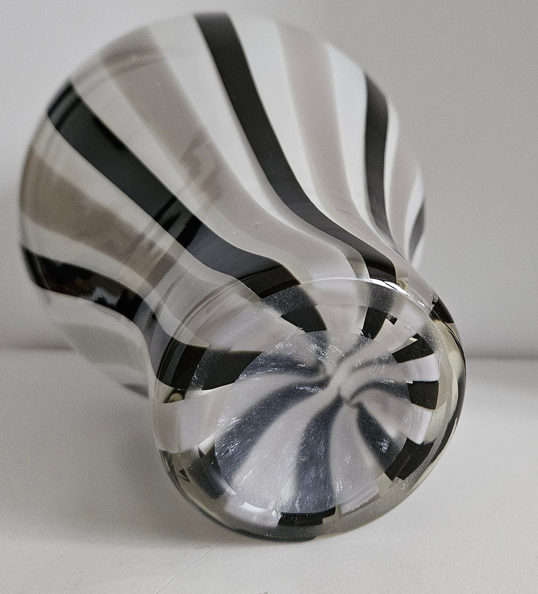 Introducing a mid-century retro striped art glass vase – a fusion of elegance and vintage charm. The vase features a white colour, adorned with sophisticated black and grey stripes, encased in clear glass for a stunning visual impact. Elevate your decor with this timeless piece that effortlessly captures the essence of mid-century design. Perfect for those who appreciate the beauty of simplicity with a touch of retro allure. Make a statement in your space with this unique blend of style and craftsmanship.