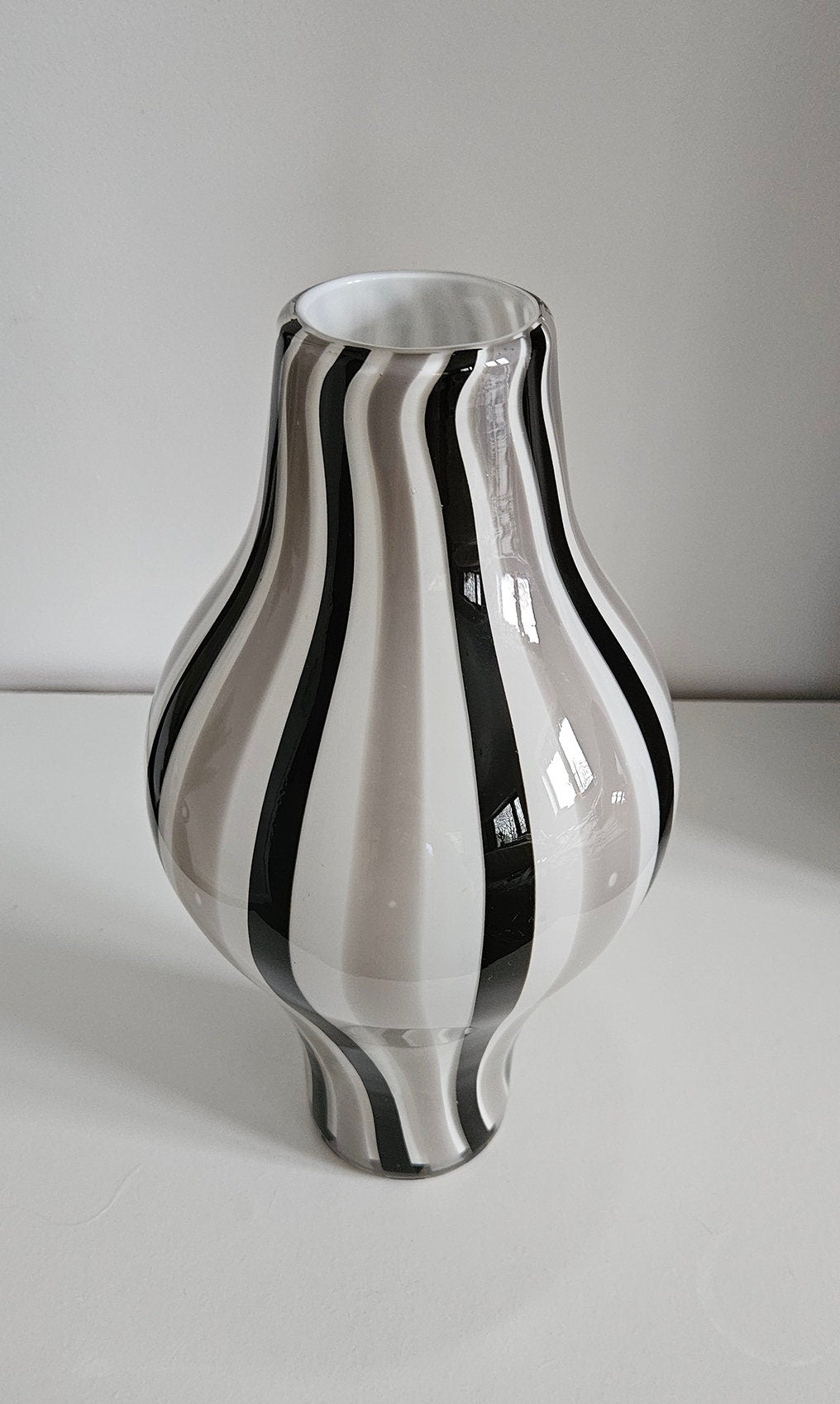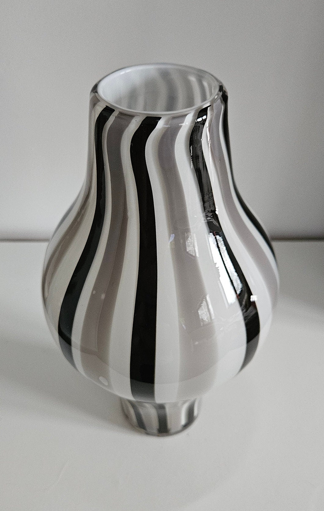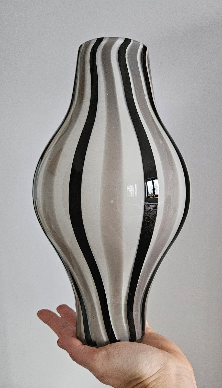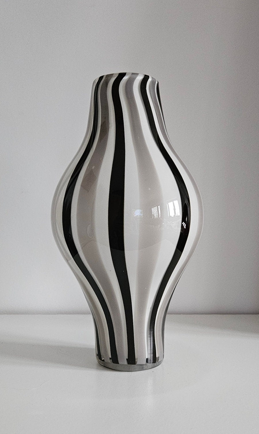 Introducing a mid-century retro striped art glass vase – a fusion of elegance and vintage charm. The vase features a white colour, adorned with sophisticated black and grey stripes, encased in clear glass for a stunning visual impact. Elevate your decor with this timeless piece that effortlessly captures the essence of mid-century design. Perfect for those who appreciate the beauty of simplicity with a touch of retro allure. Make a statement in your space with this unique blend of style and craftsmanship.