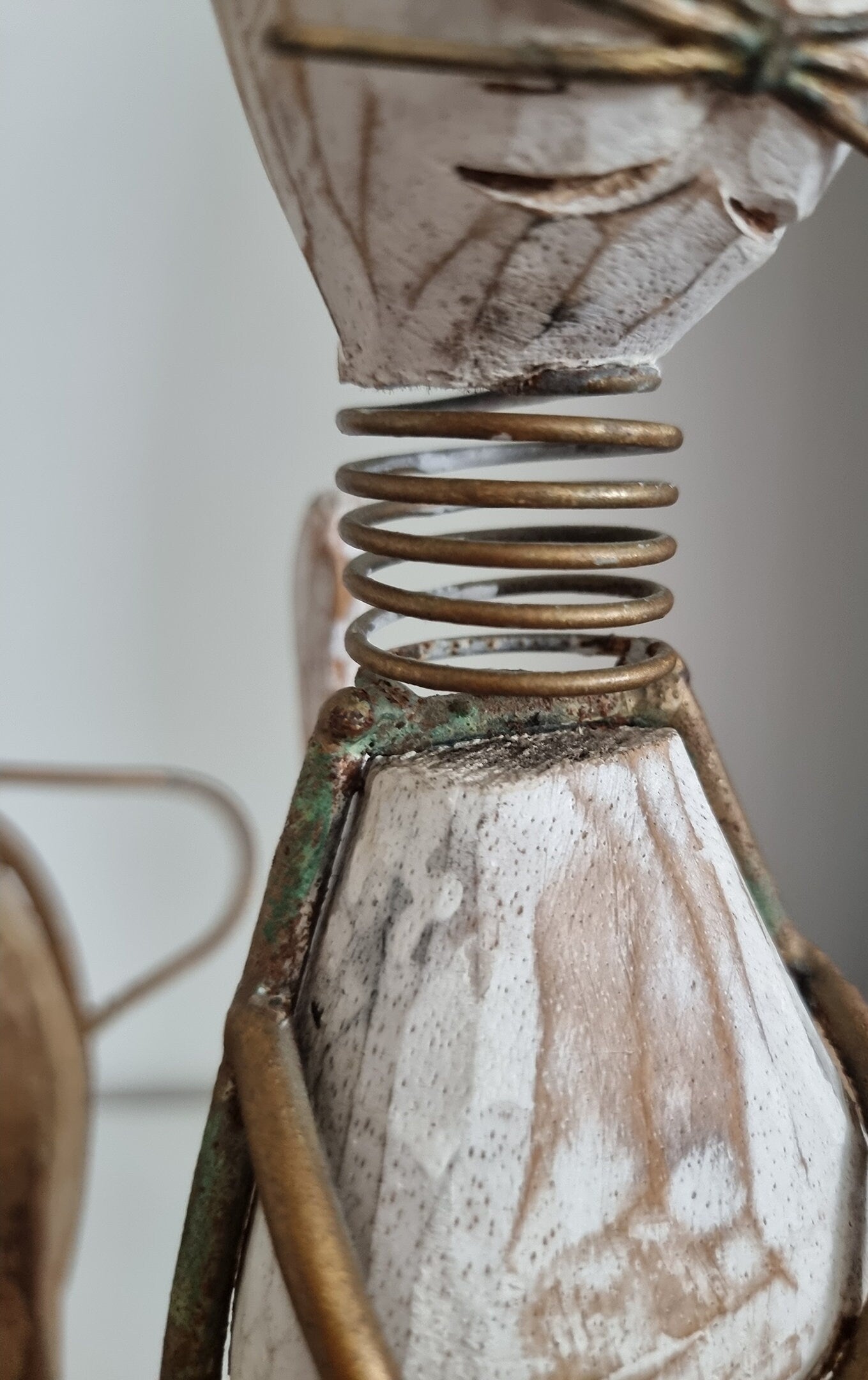Pair of wooden cat figurines/sculptures with metal spring necks in great vintage condition with some age-related wear. One of the cats has a repair on the leg - is not immediately obvious, but it would be visible upon close inspection.