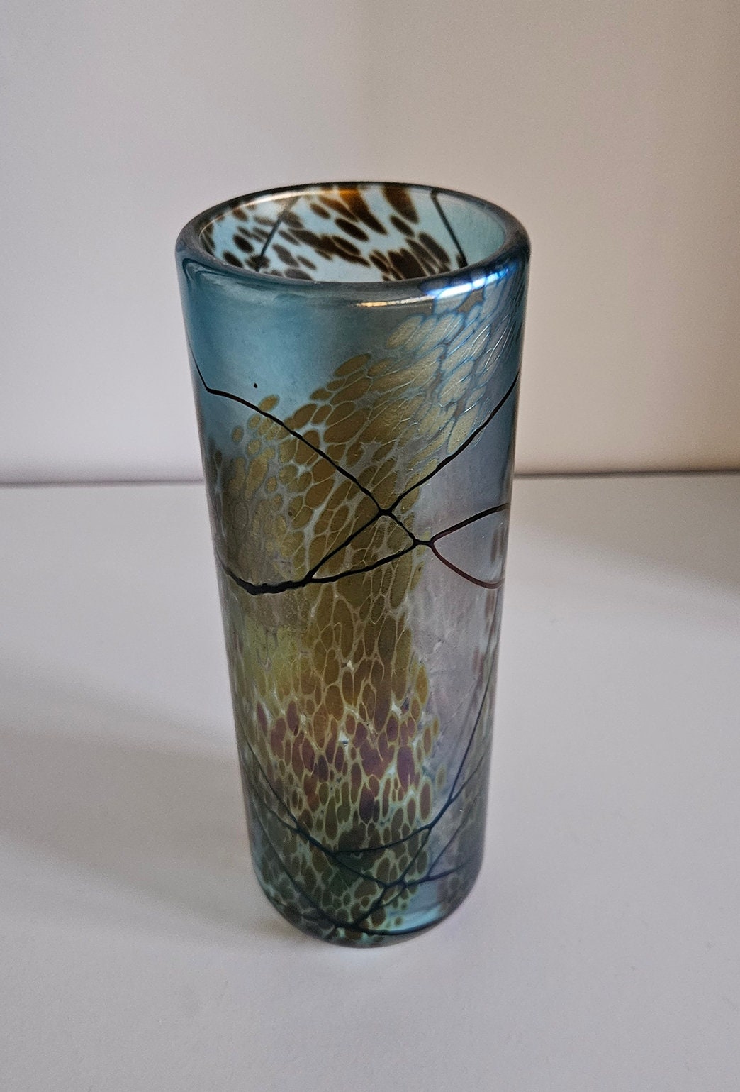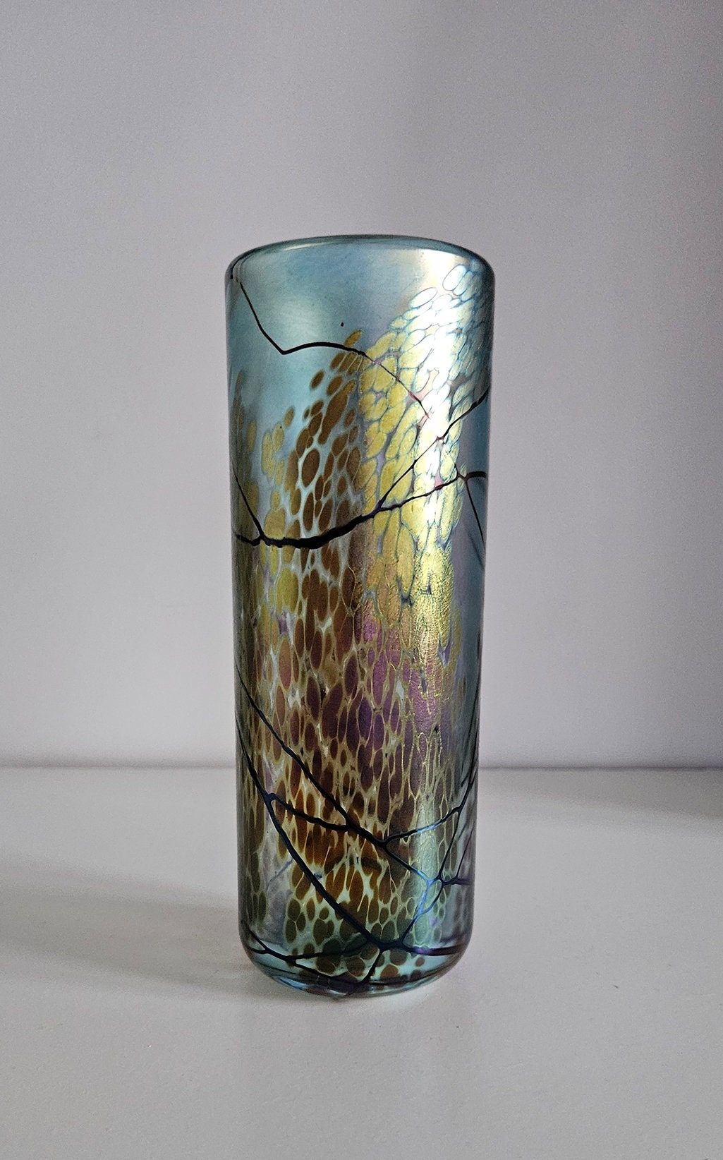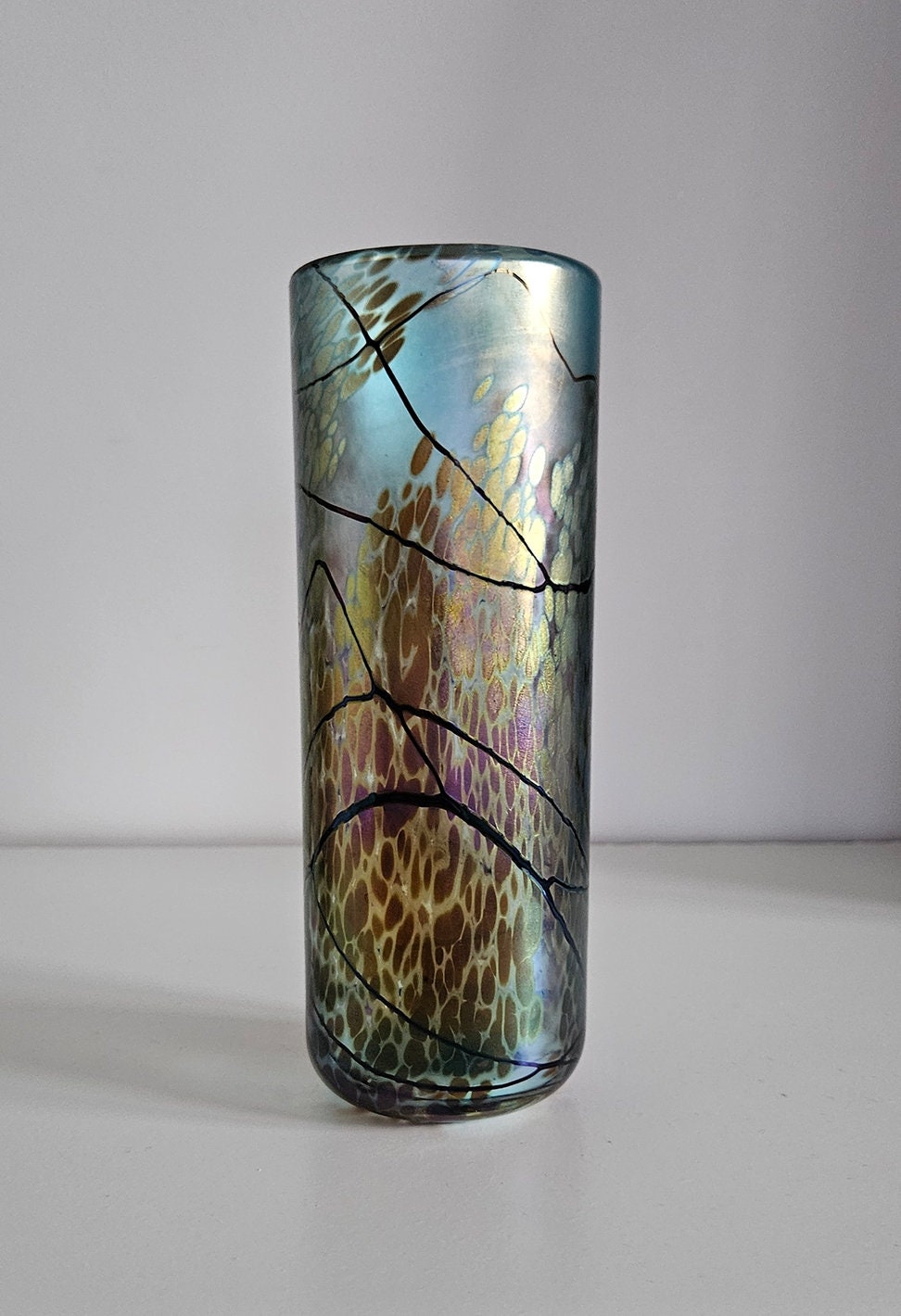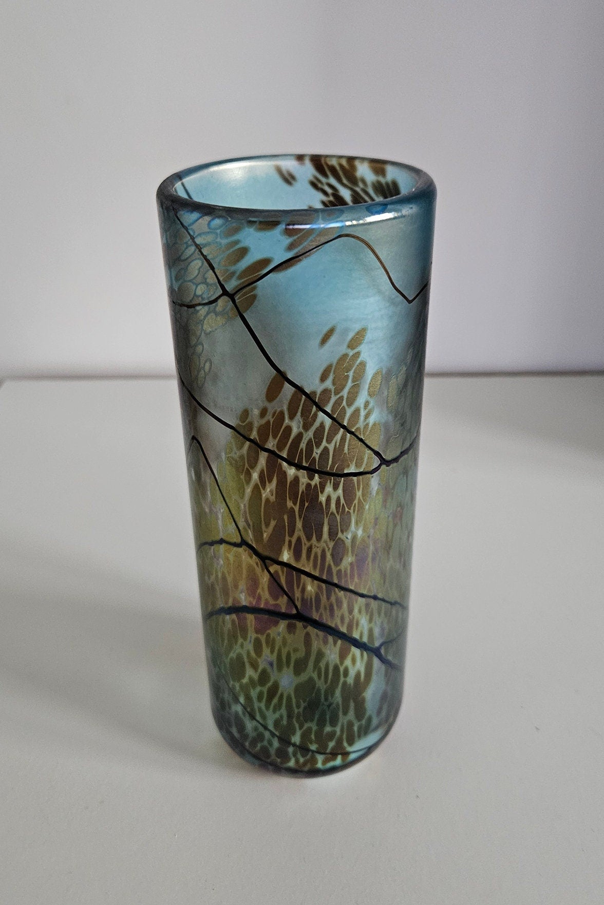 Introducing a true masterpiece: the stunning Okra art glass vase with iridescent lustre, personally signed by the renowned artist Dean Hopkins and stamped with the official mark of authenticity, dated 2009. This exquisite vase is not just a piece of art; it's a testament to craftsmanship and creativity.