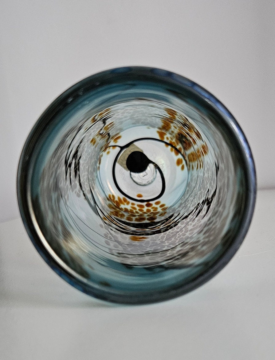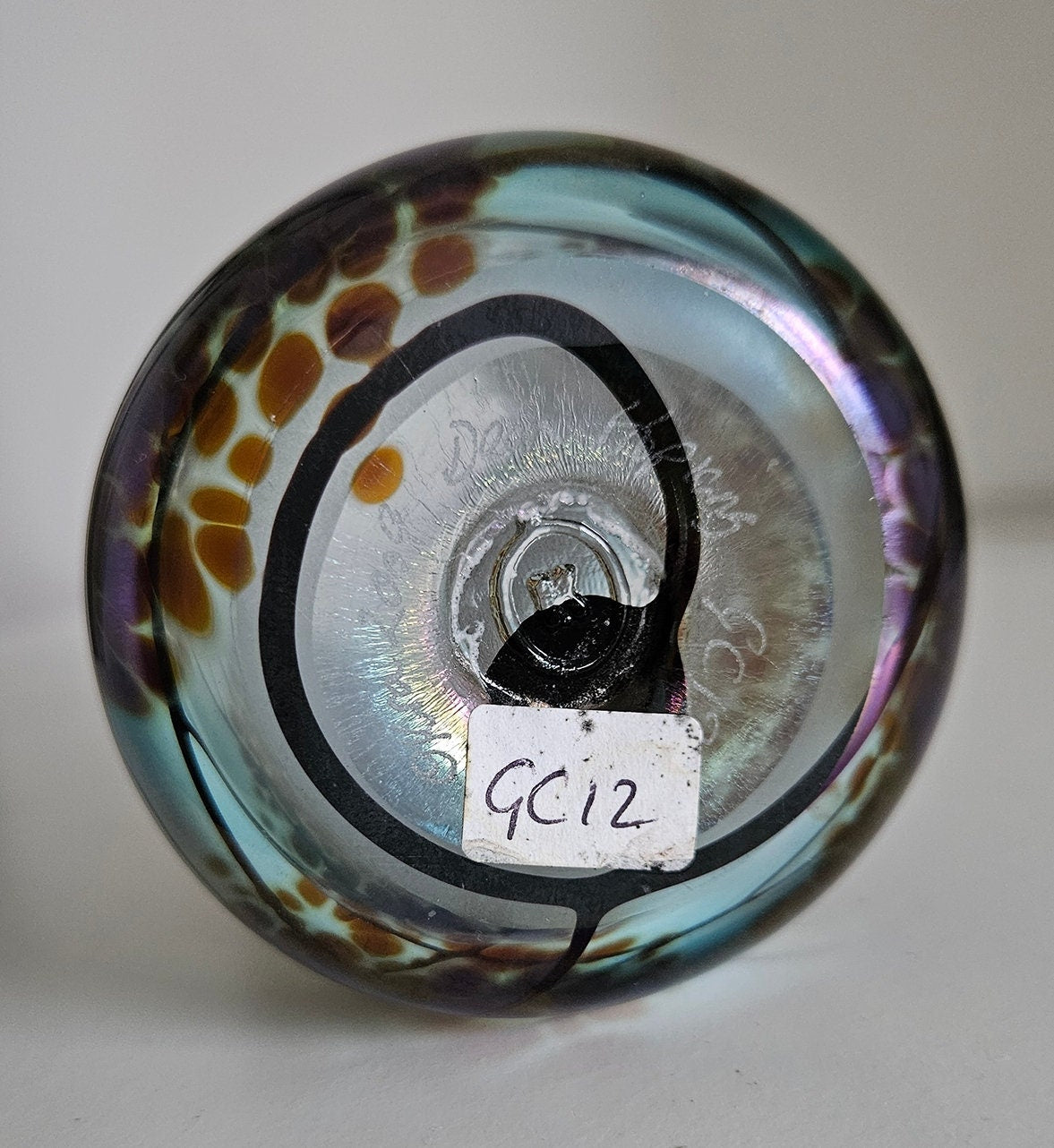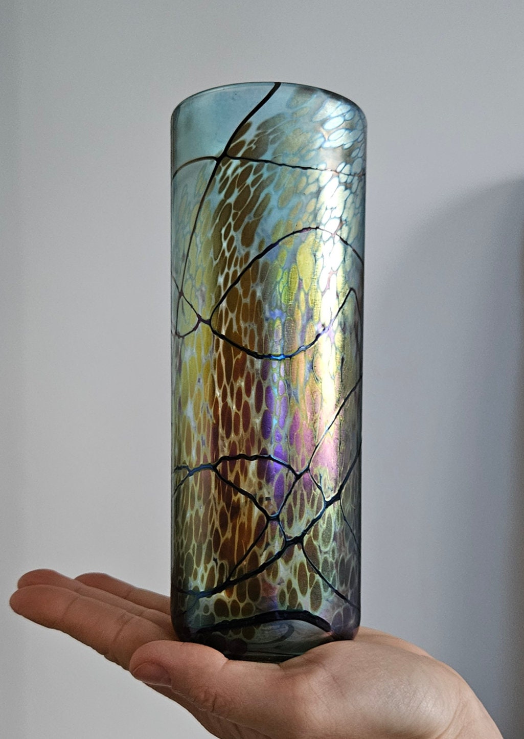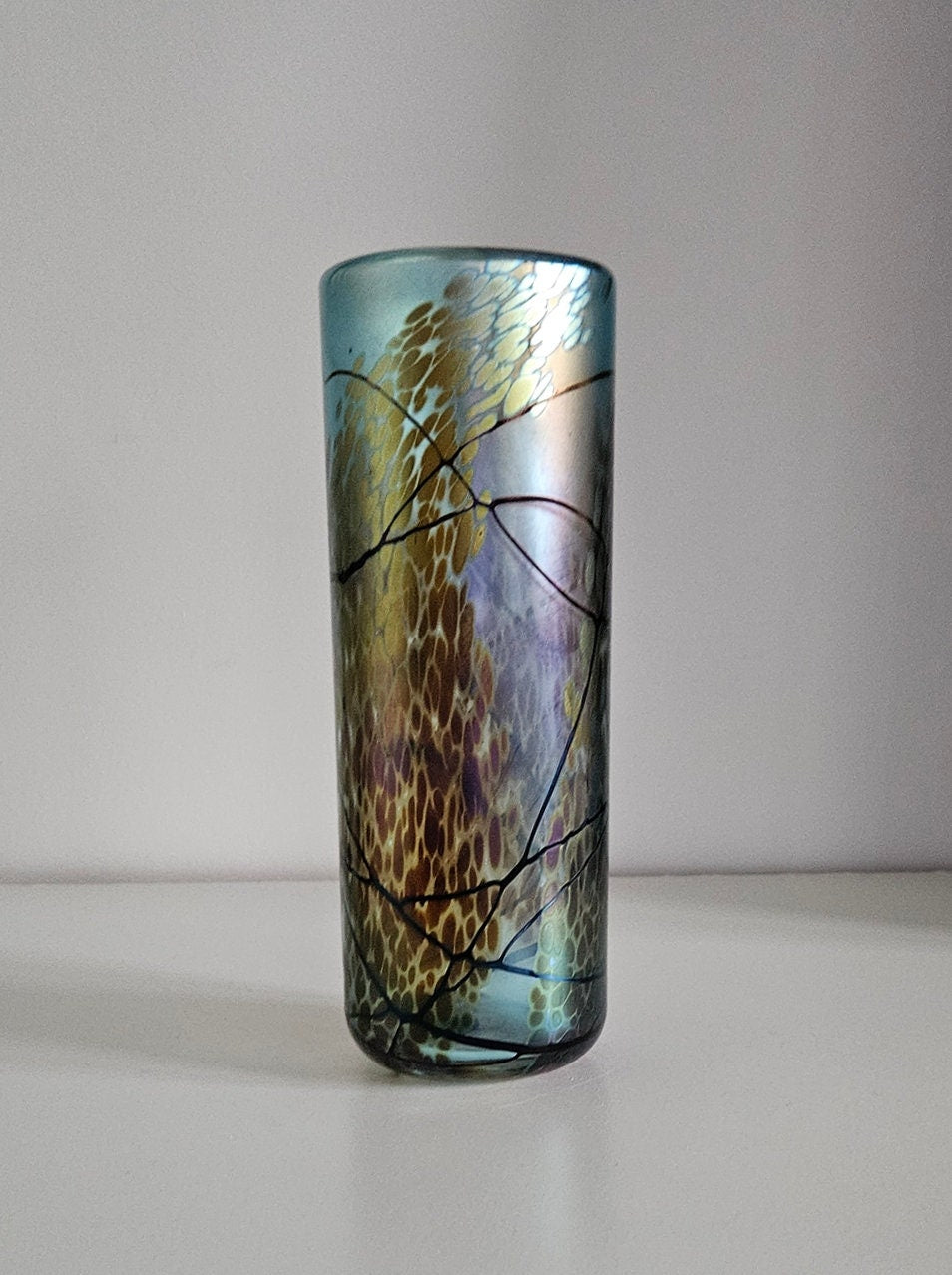 Introducing a true masterpiece: the stunning Okra art glass vase with iridescent lustre, personally signed by the renowned artist Dean Hopkins and stamped with the official mark of authenticity, dated 2009. This exquisite vase is not just a piece of art; it's a testament to craftsmanship and creativity.