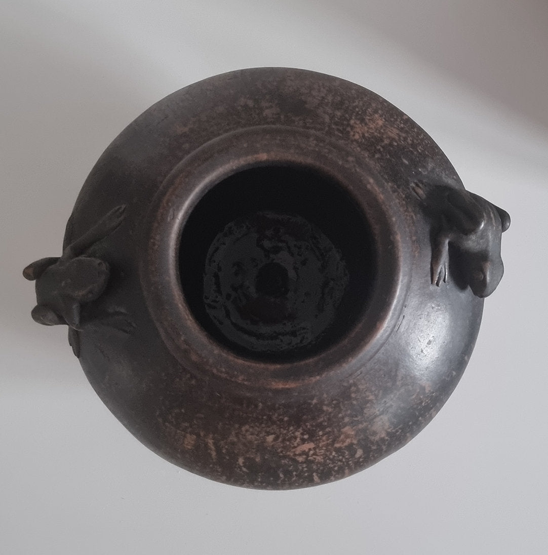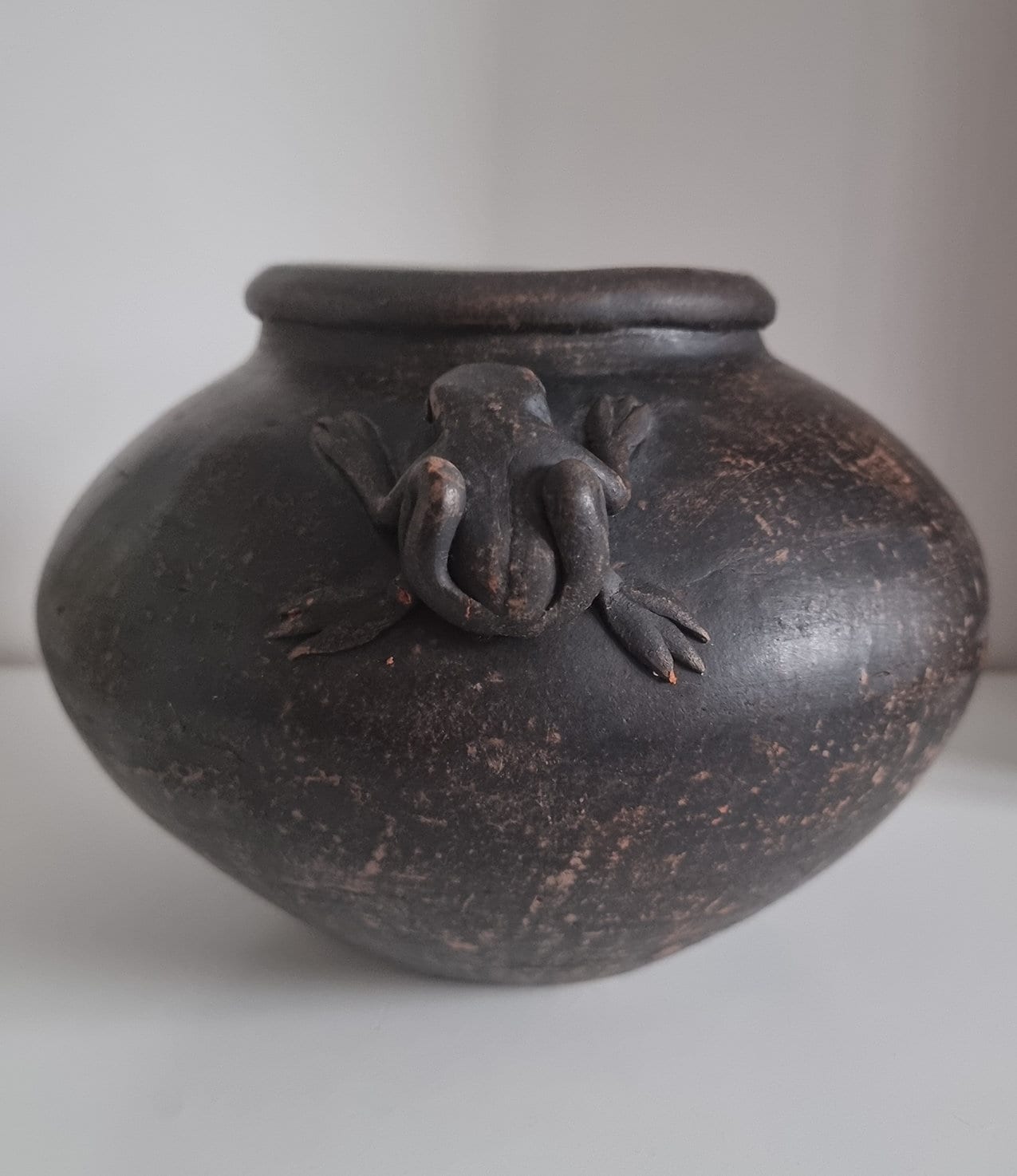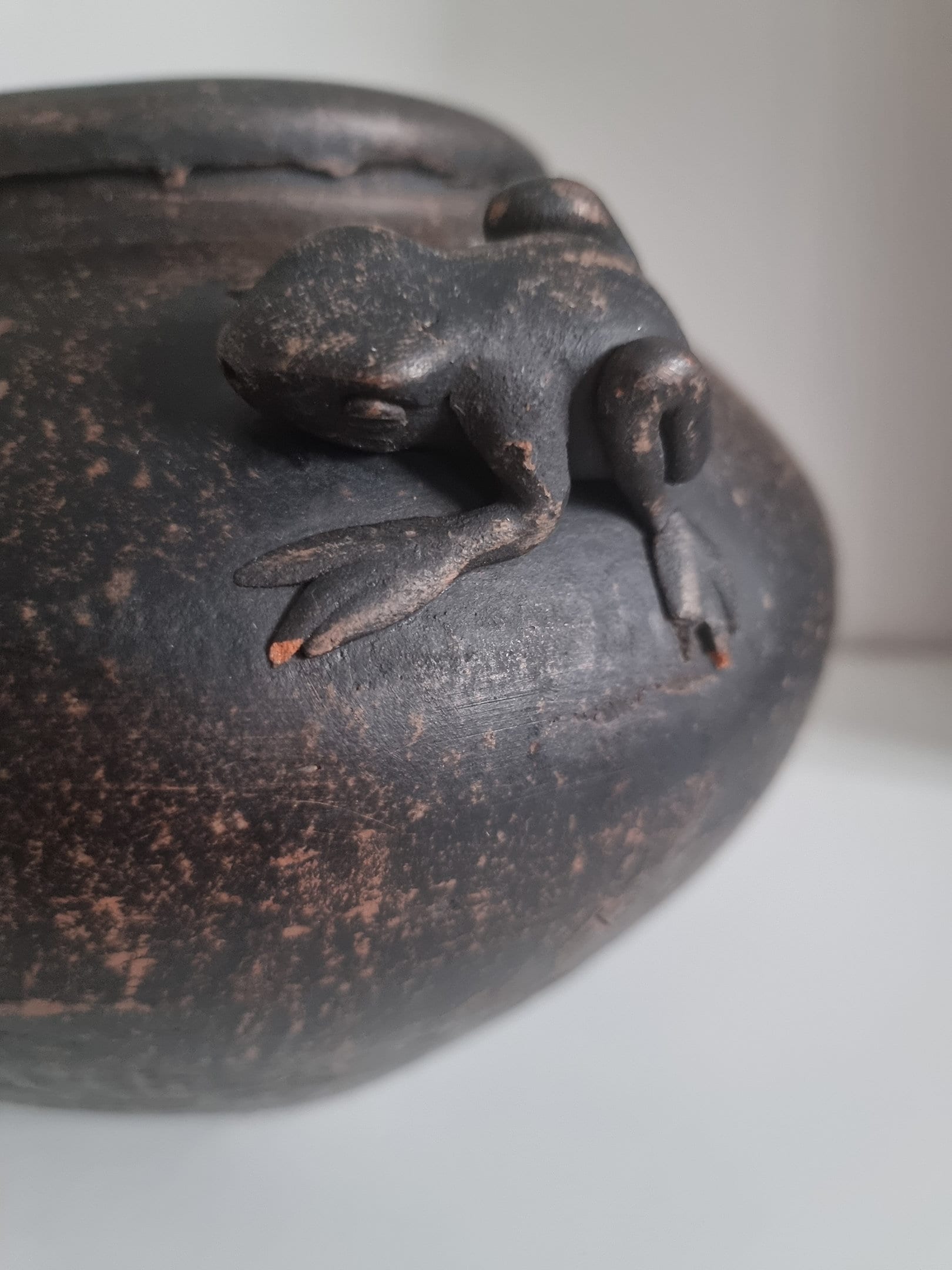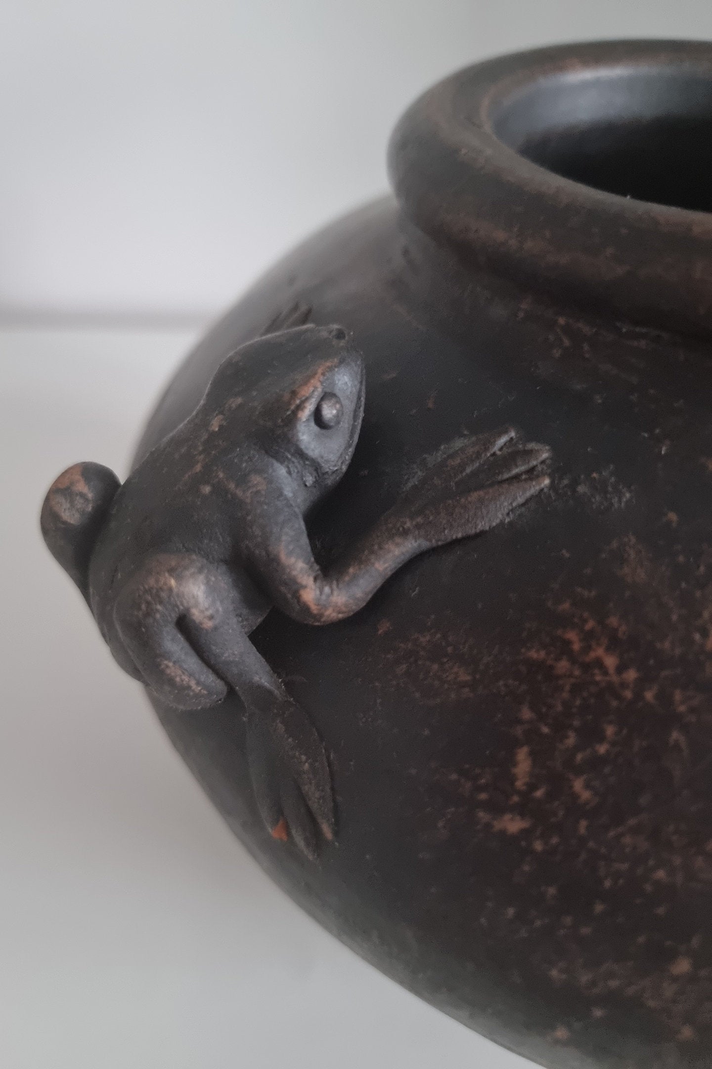 Introducing a whimsical touch to your decor – the vintage brown pottery vase/pot with frogs. There are some minor imperfections on the sides, please see photos for details.