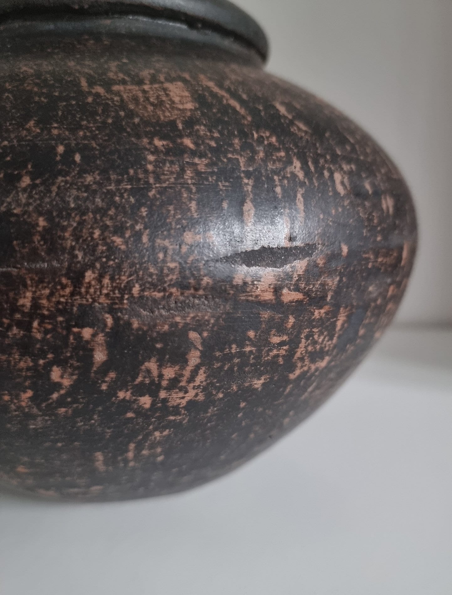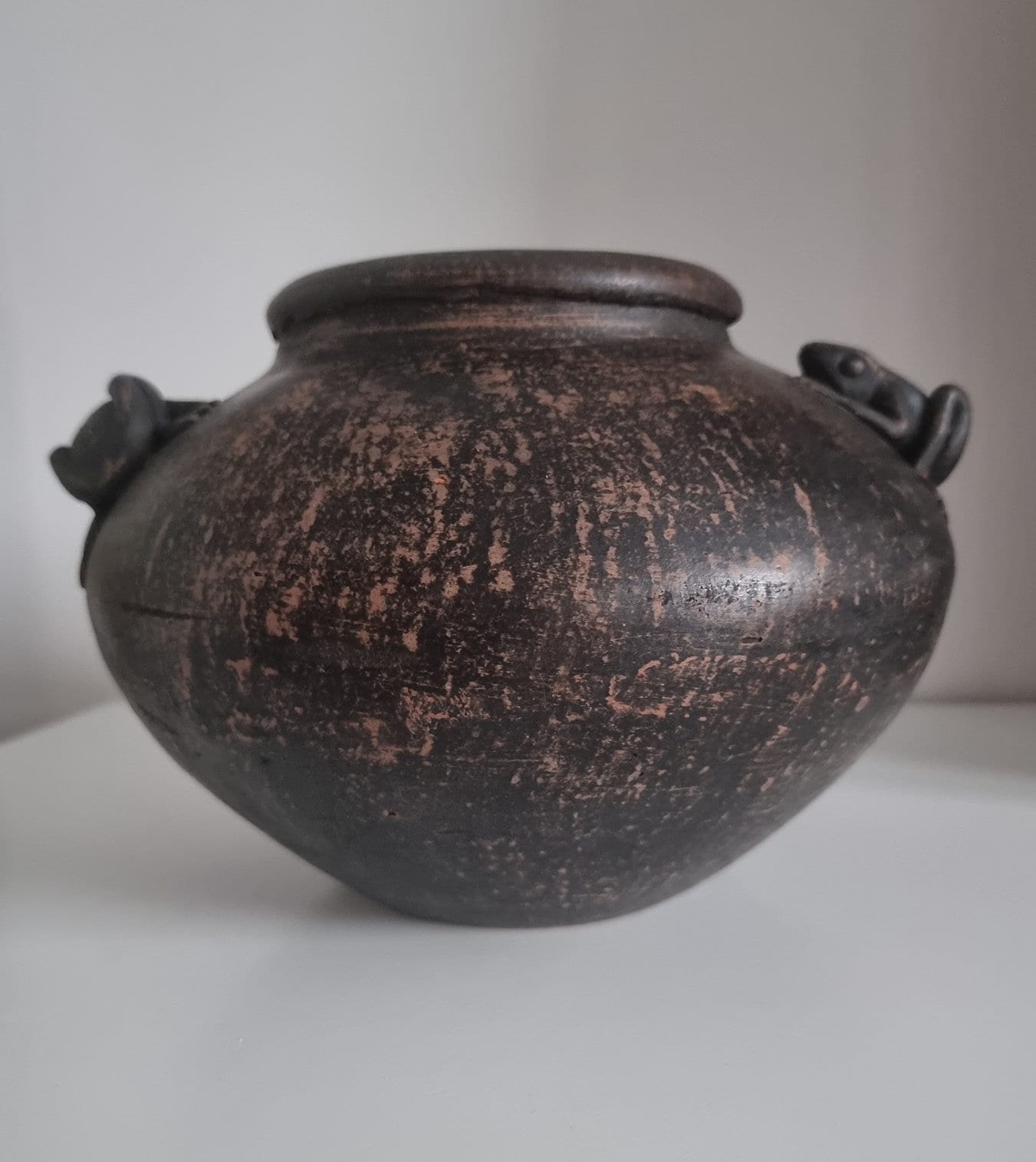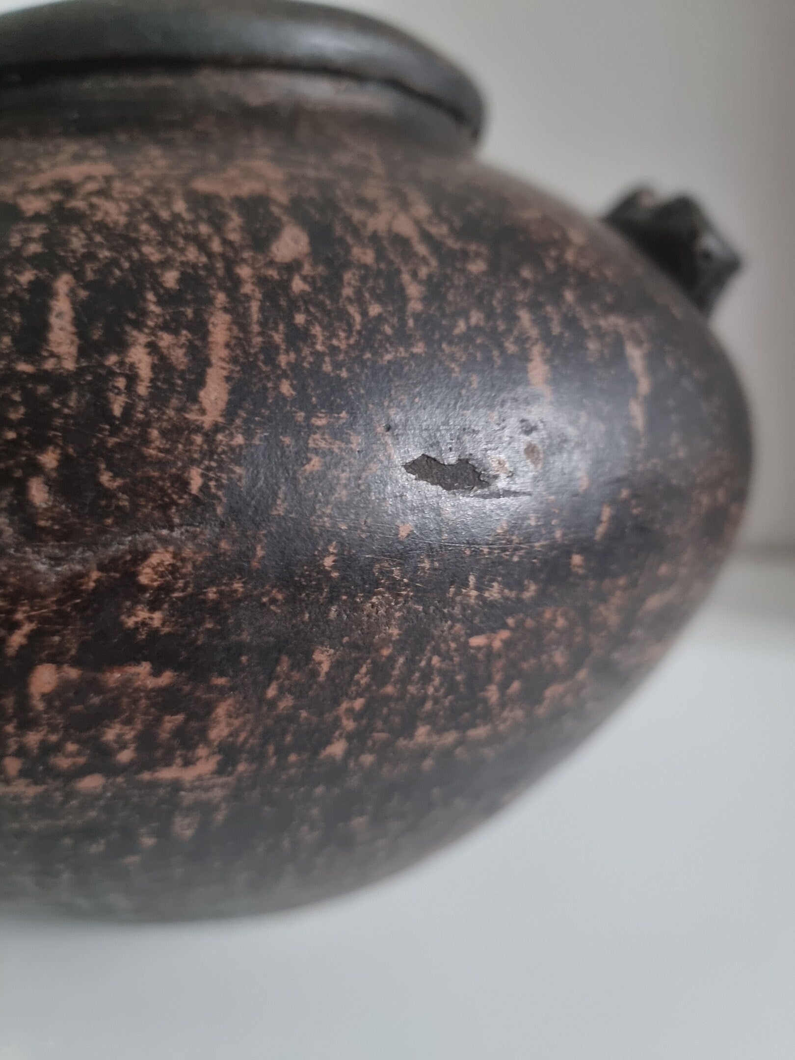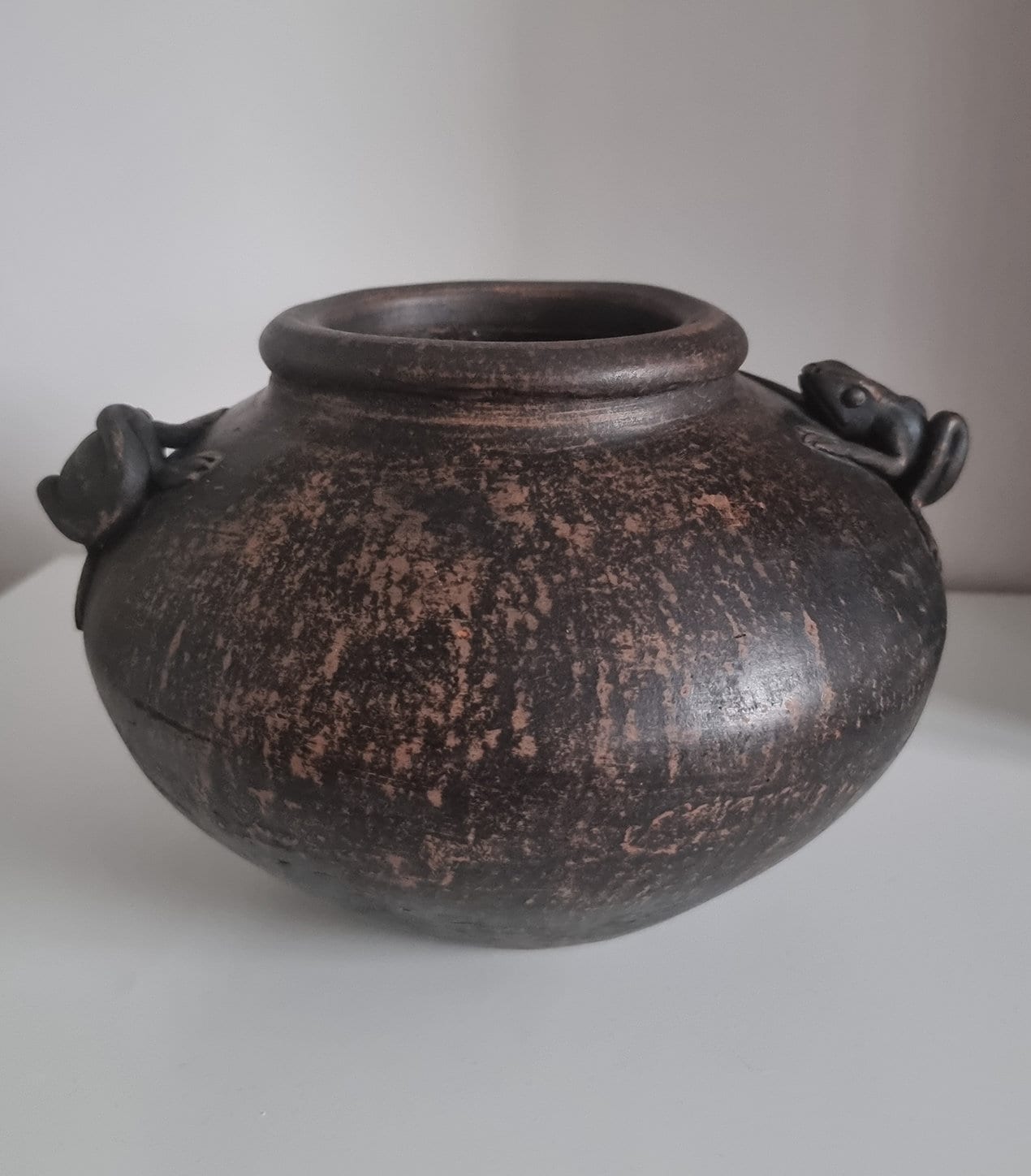 Introducing a whimsical touch to your decor – the vintage brown pottery vase/pot with frogs. There are some minor imperfections on the sides, please see photos for details.