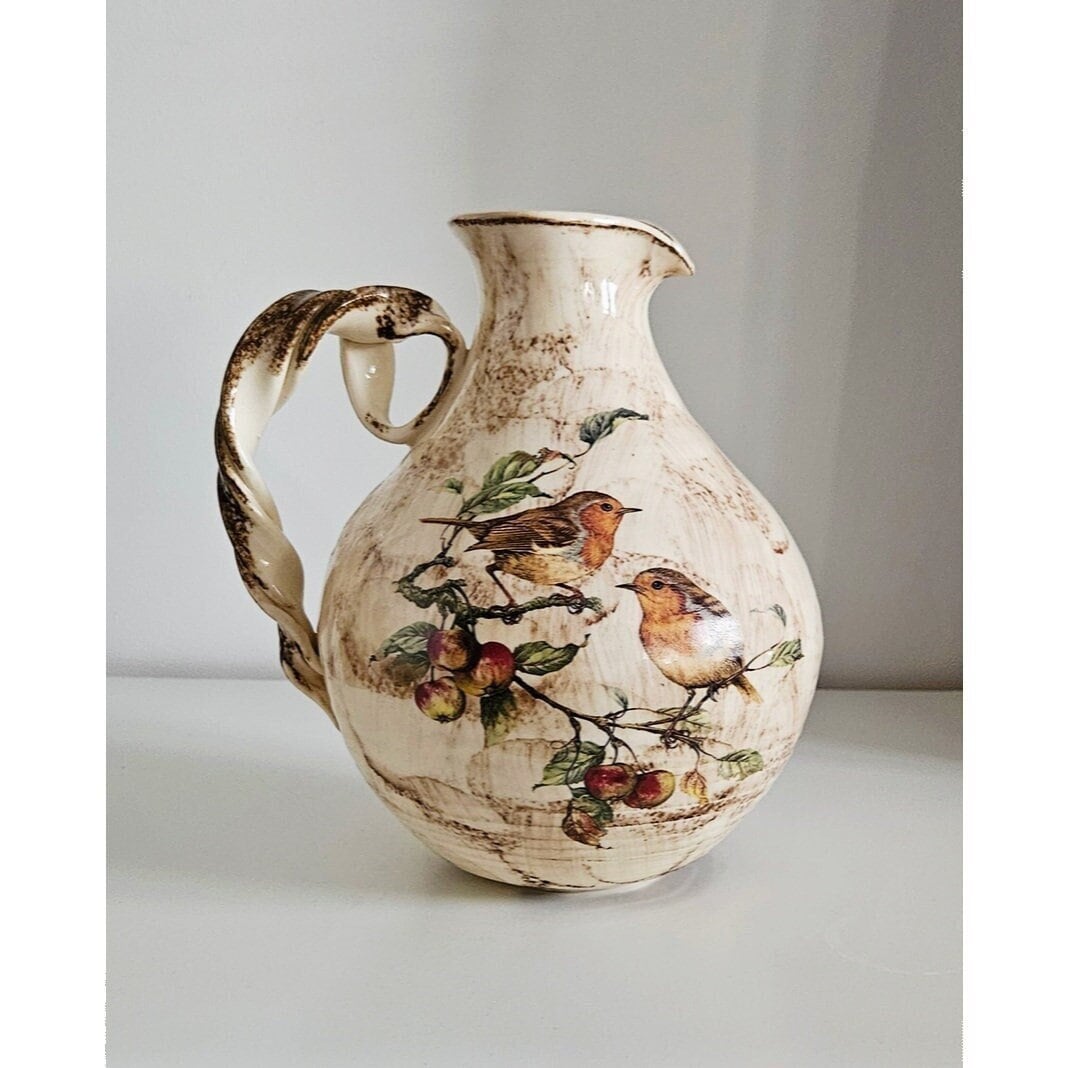 Introducing our exquisite vintage ceramic jug/vase adorned with enchanting floral & bird motifs – a timeless piece that seamlessly blends elegance and nostalgia.