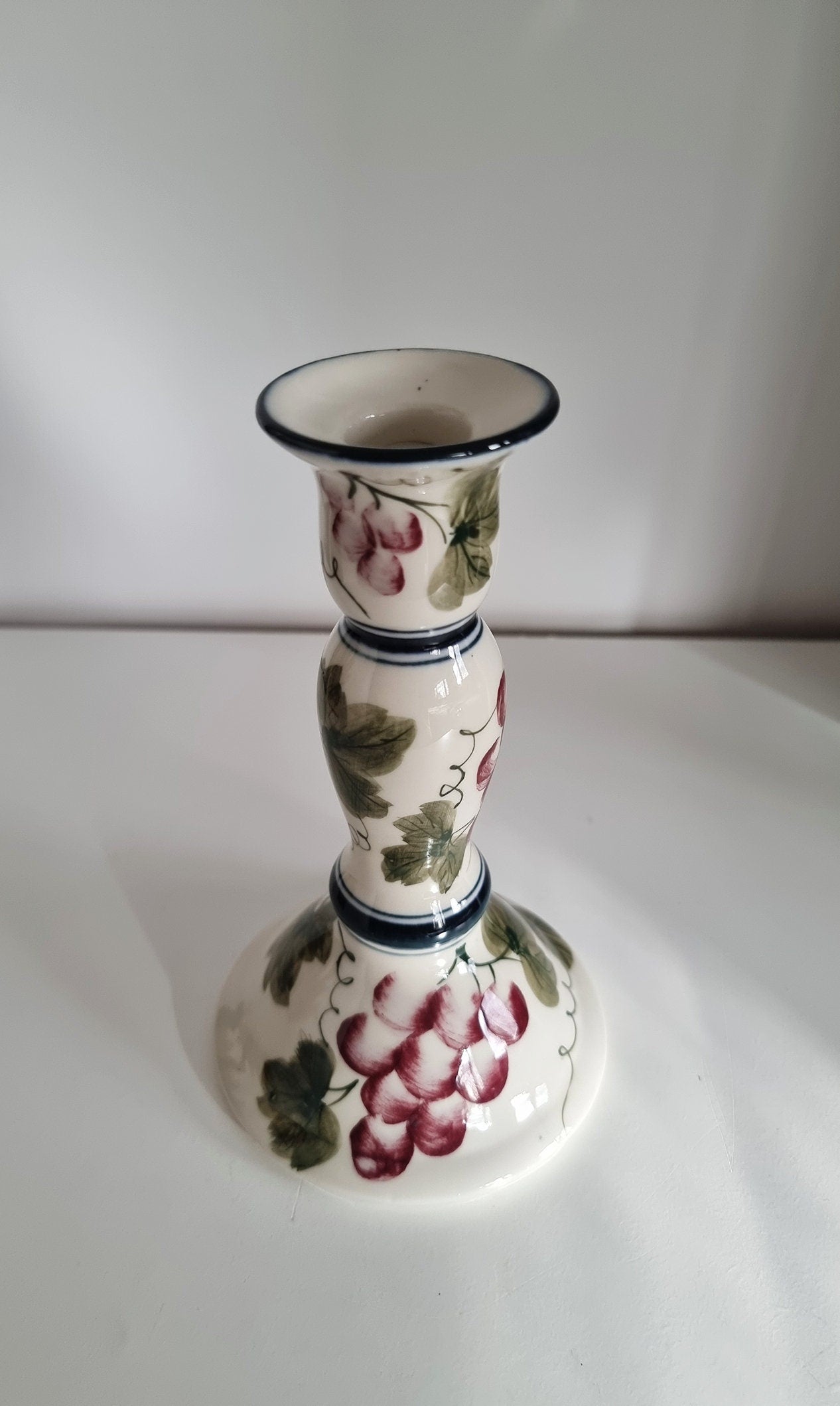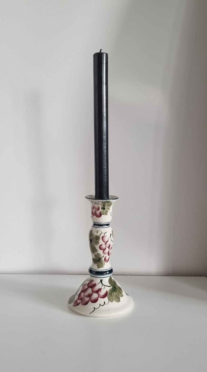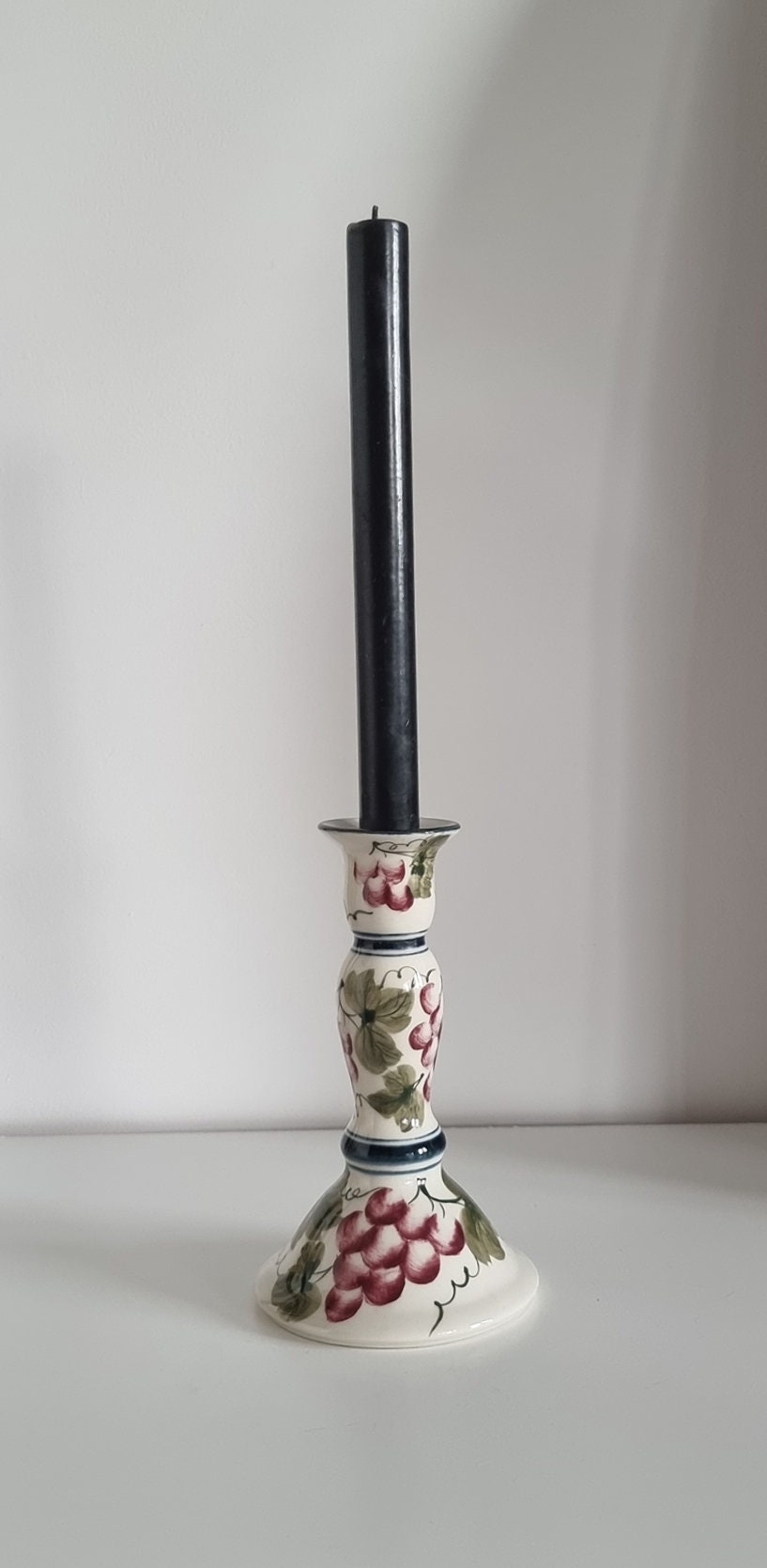 Vintage hand painted ceramic candlestick in great condition. The vintage allure of this candlestick is enhanced by its unique grape design, adding a touch of rustic elegance to your home decor. Crafted with care, this ceramic piece exudes a timeless appeal that complements various interior styles.