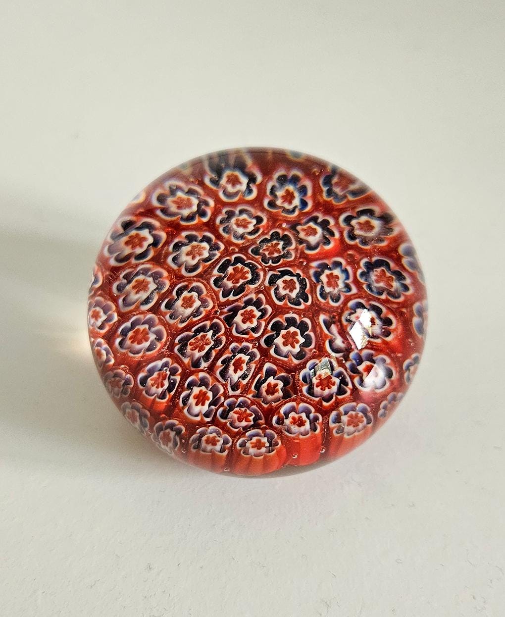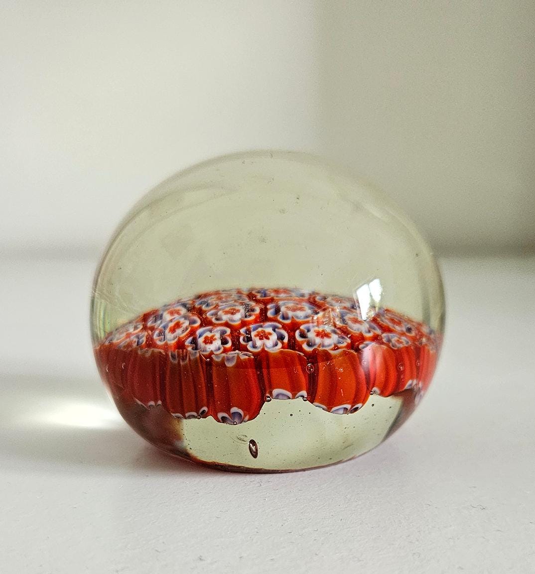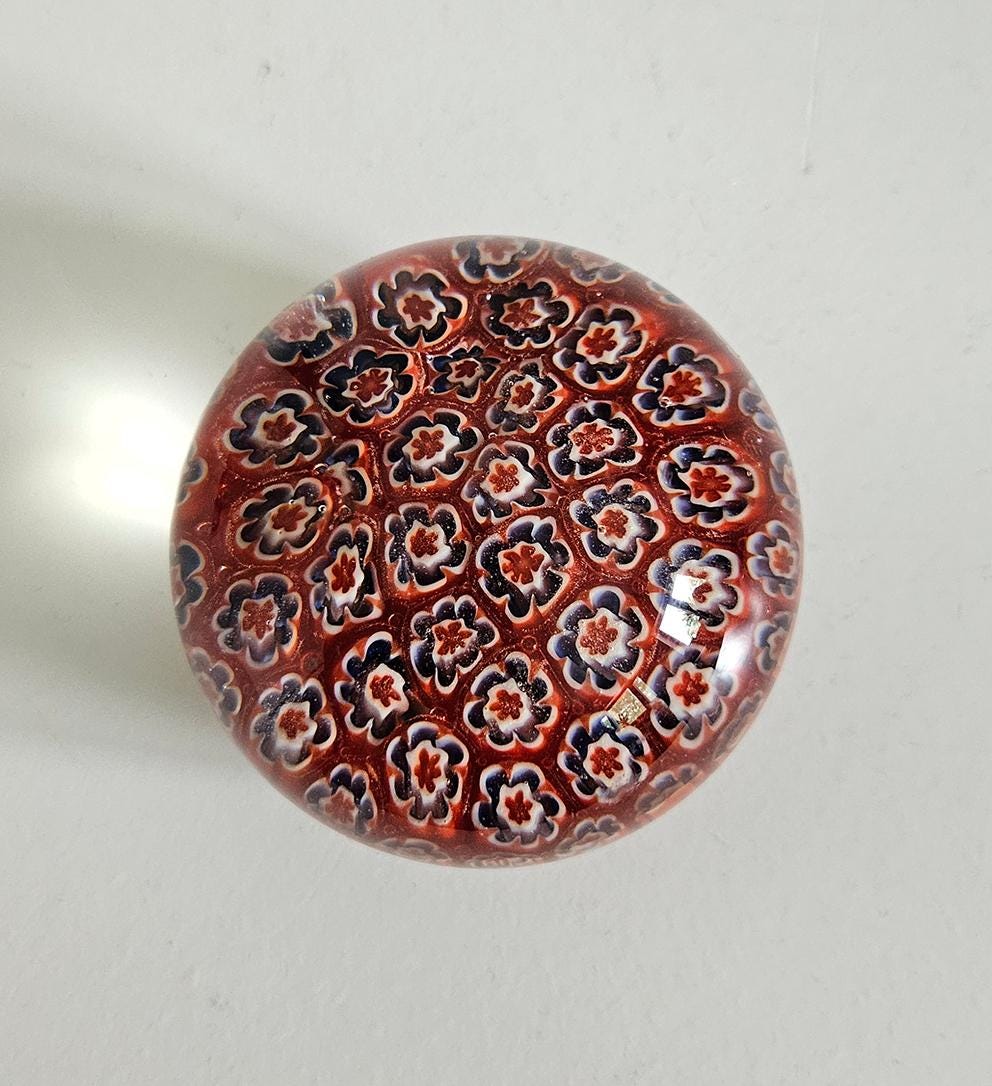 Add a touch of artistry to your space with this exquisite vintage millefiori art glass paperweight! Crafted with intricate detail, this paperweight features a mesmerizing array of flowers, each meticulously arranged in a beautiful pattern. Perfect for collectors or as a decorative accent on any desk or shelf.