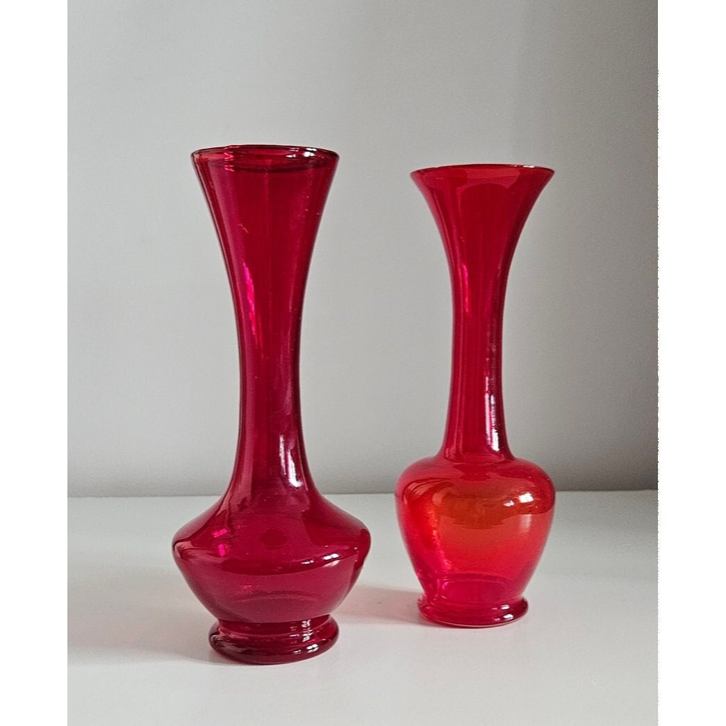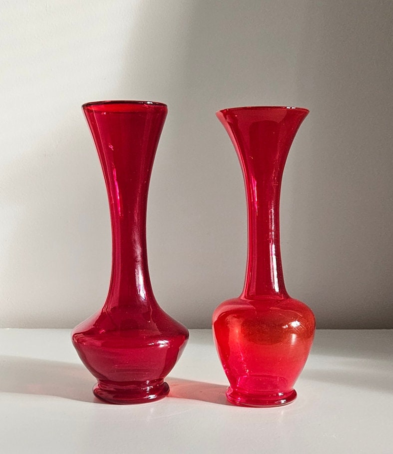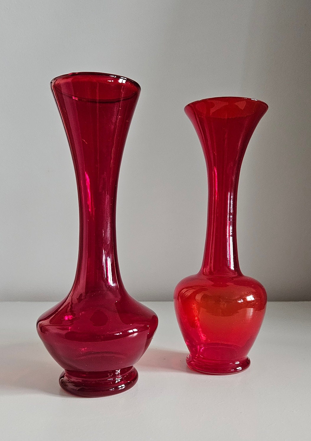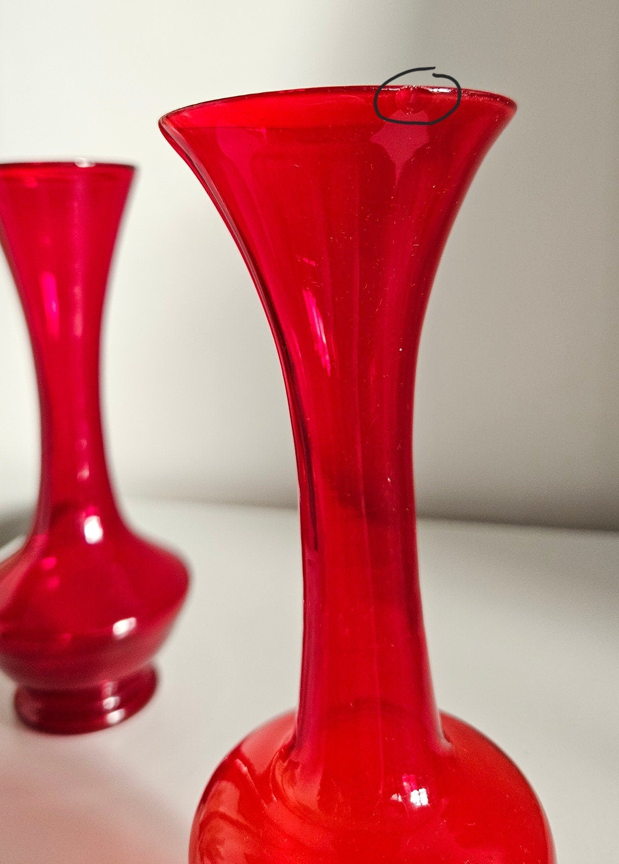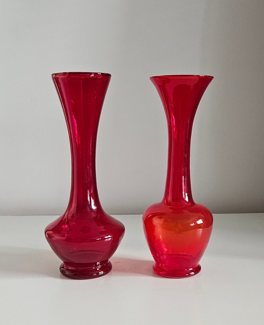 Add a touch of vintage charm to your decor with this delightful pair of small red bud vases.